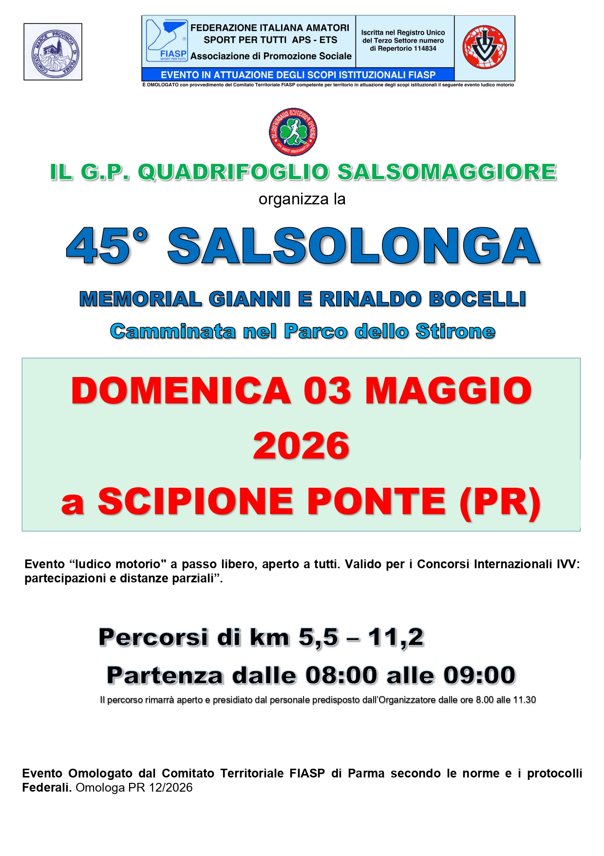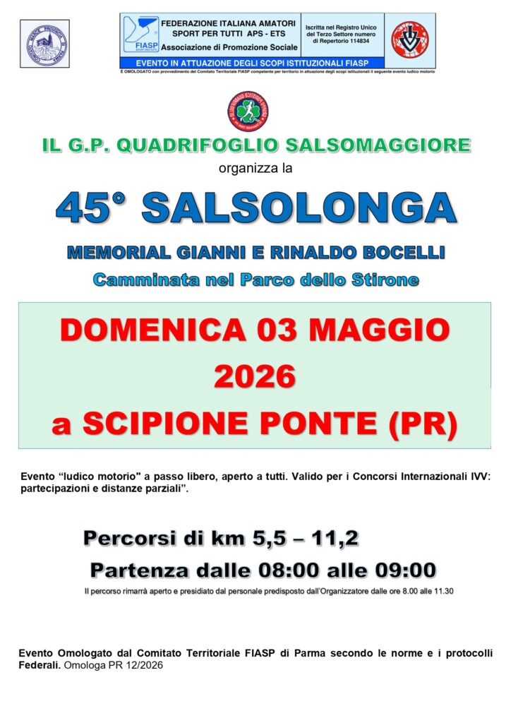 45° Salsalonga Data: 03/05/2026 Località: Scipione Monte (Pr) 📌 Luogo: Emilia-Romagna / Parma⏰ Orario: dalle 8 alle 9📏 Distanza (max): 11.2 km📍 Indirizzo: Monte di Scipione, Salsomaggiore Terme, Parma, Emilia-Romagna, 43039, ItaliaDescrizione: Km11,2 - Km 5,5 Volantino / Regolamento