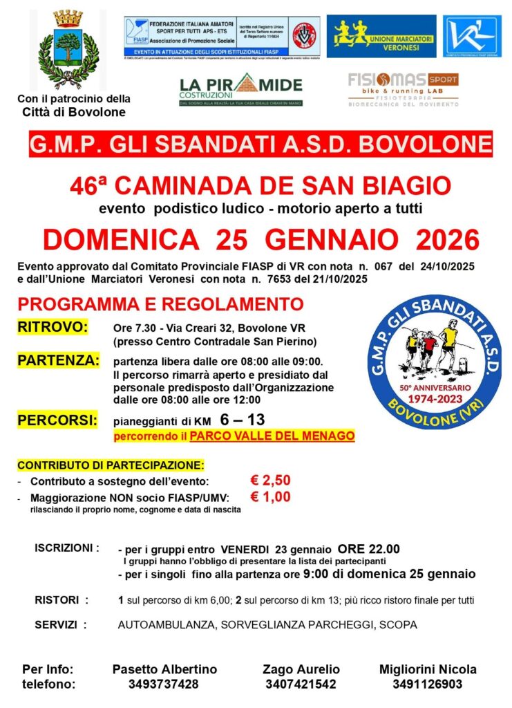 46° Caminada de San Biagio Data: 25/01/2026 Località: Bovolone (Vr) 📌 Luogo: Veneto / Verona📏 Distanza (max): 13 km📞 Telefono: 349.3737428 - 340.7421542 - 349.1126903Descrizione: Ludico motoria di Km 13 e Km 6. Partenza ore 08:00/09:00 c/o dal Centro Sportivo San Pierino, via Creari 32 Volantino / Regolamento