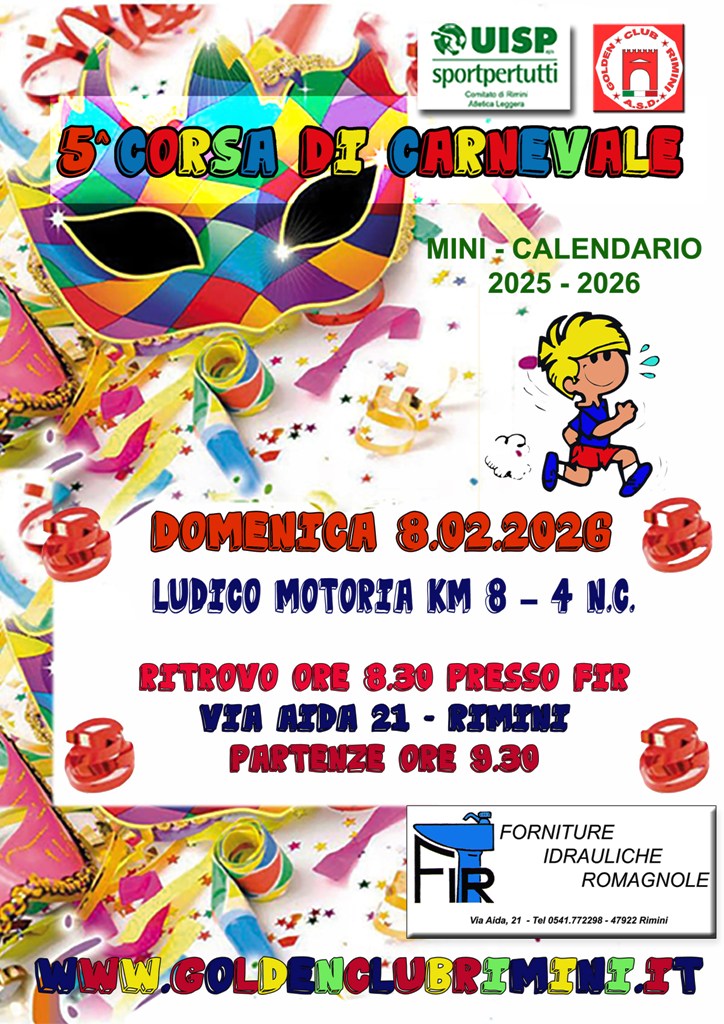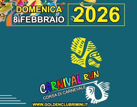 5° Corsa di Carnevale Data: 08/02/2026 Località: Rimini (Rn) 📌 Luogo: Emilia-Romagna / Rimini📏 Distanza (max): 8.5 km🔗 Sito: www.goldenclubrimini.it📞 Telefono: 333.3212357Descrizione: Ludico motoria di Km 8 e Km 4. Partenza ore 09:30 c/o Fir, via Aida 21 Volantino / Regolamento
