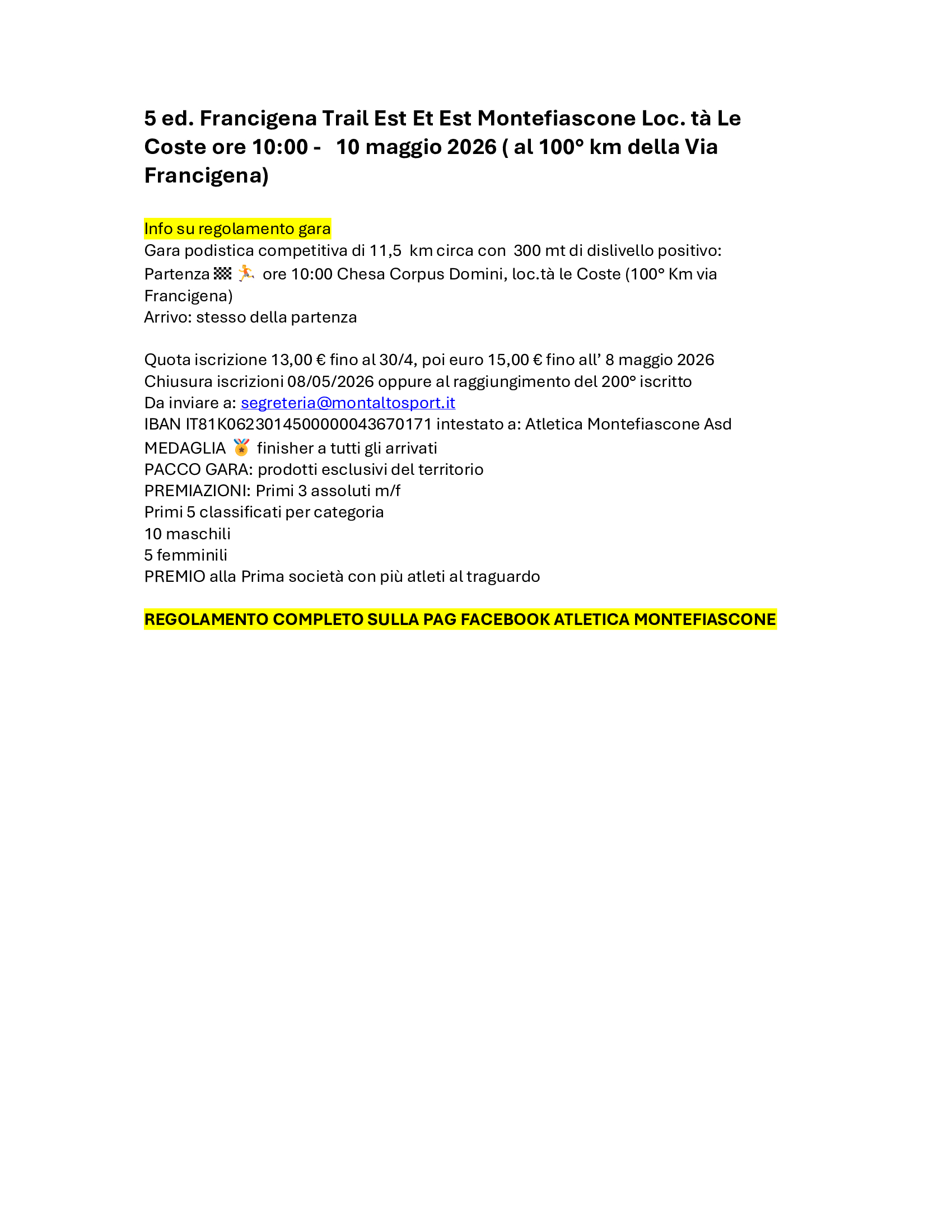 5° Francigena Trail 100esimo Km Data: 10/05/2026 Località: Montefiascone (Vt) 🏆 📌 Luogo: Lazio / Viterbo⏰ Orario: 10📏 Distanza (max): 11.50 km📍 Indirizzo: Via Francigena Chiesa del Corpus Domini Montefiascone (Viterbo)Descrizione: 11,500 Km (D+300M) Volantino / Regolamento
