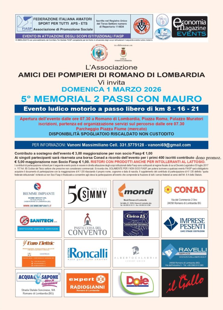5° Memorial 2 Passi con Mauro Data: 01/03/2026 Località: Romano di Lombardia (Bg) 📌 Luogo: Lombardia / Bergamo📏 Distanza (max): 21 km📧 Email: vanoni69@gmail.com📞 Telefono: 331.5775128Descrizione: Ludico motoria di Km 21 - 16 - 8. Partenza ore 07:30/09:00 c/o Palazzo Muratori, Piazza Roma Volantino / Regolamento