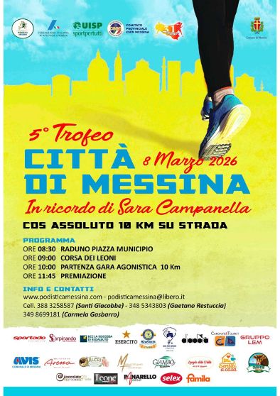 5° Trofeo Citta’ di Messina Data: 08/03/2026 Località: Messina (Me) 🏆 🏅 Classifica: Clicca qui 📌 Luogo: Sicilia / Messina📏 Distanza (max): 10 km📍 Indirizzo: Messina, Sicilia, ItaliaDescrizione: Km 10 Volantino / Regolamento