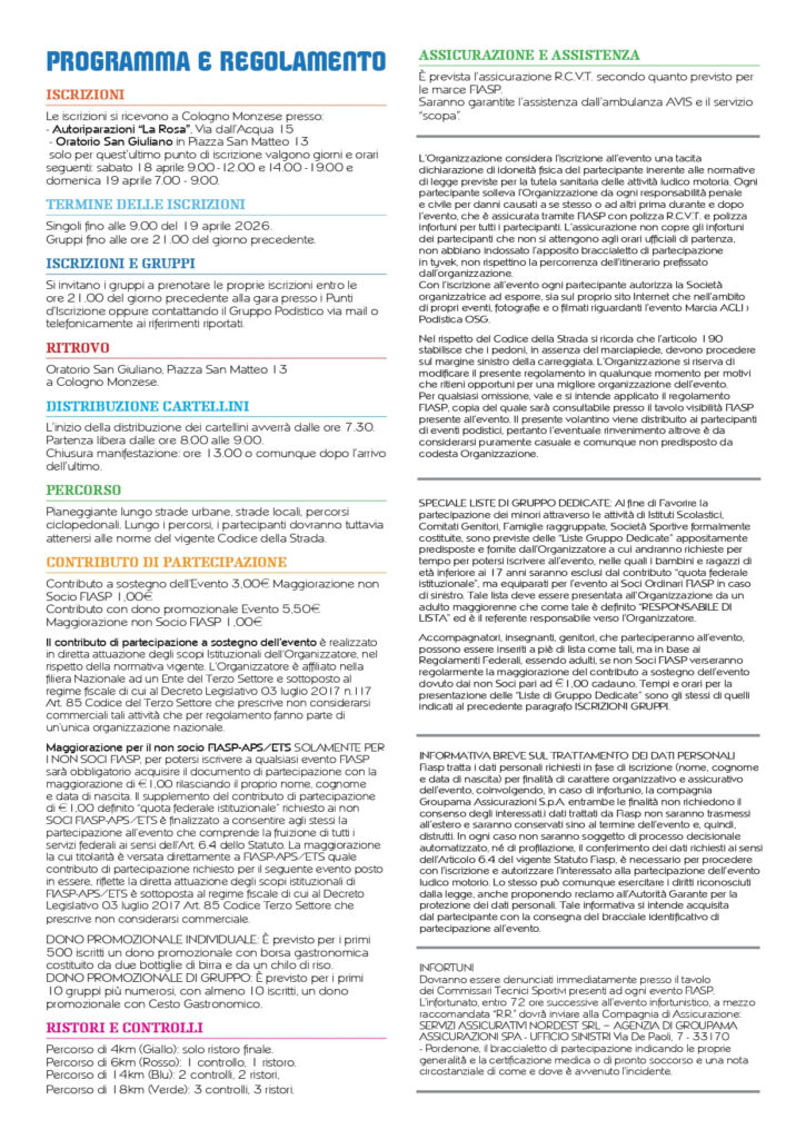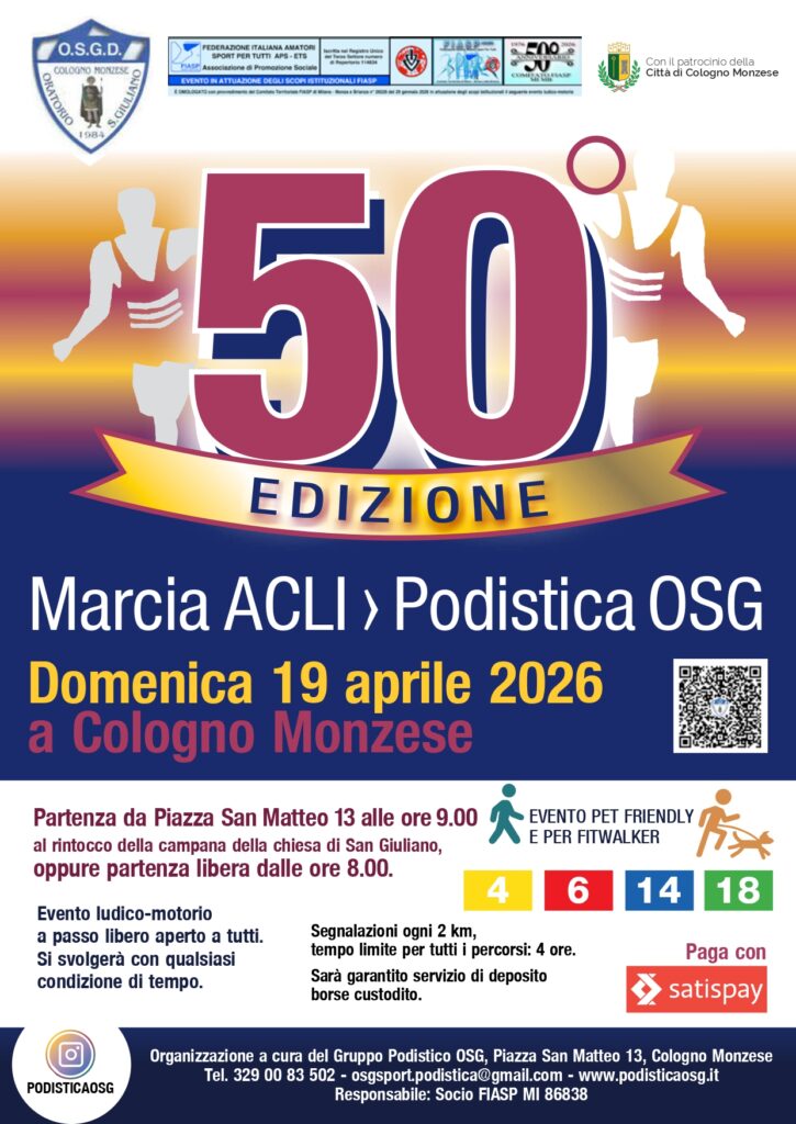 Descrizione: La sezione podistica del gruppo sportivo di San Giuliano di Cologno Monzese organizzerà per domenica 19 aprile 2026 la 50° della Marcia ACLI/OSG Podistica, marcia storica, che attraversa quattro comuni: Cologno Monzese, Brugherio, Cernusco sul Naviglio e Vimodrone, su quattro percorsi di 4, 6, 14 e 18 km. Parte del percorso percorrerà l'alzaia del Naviglio
