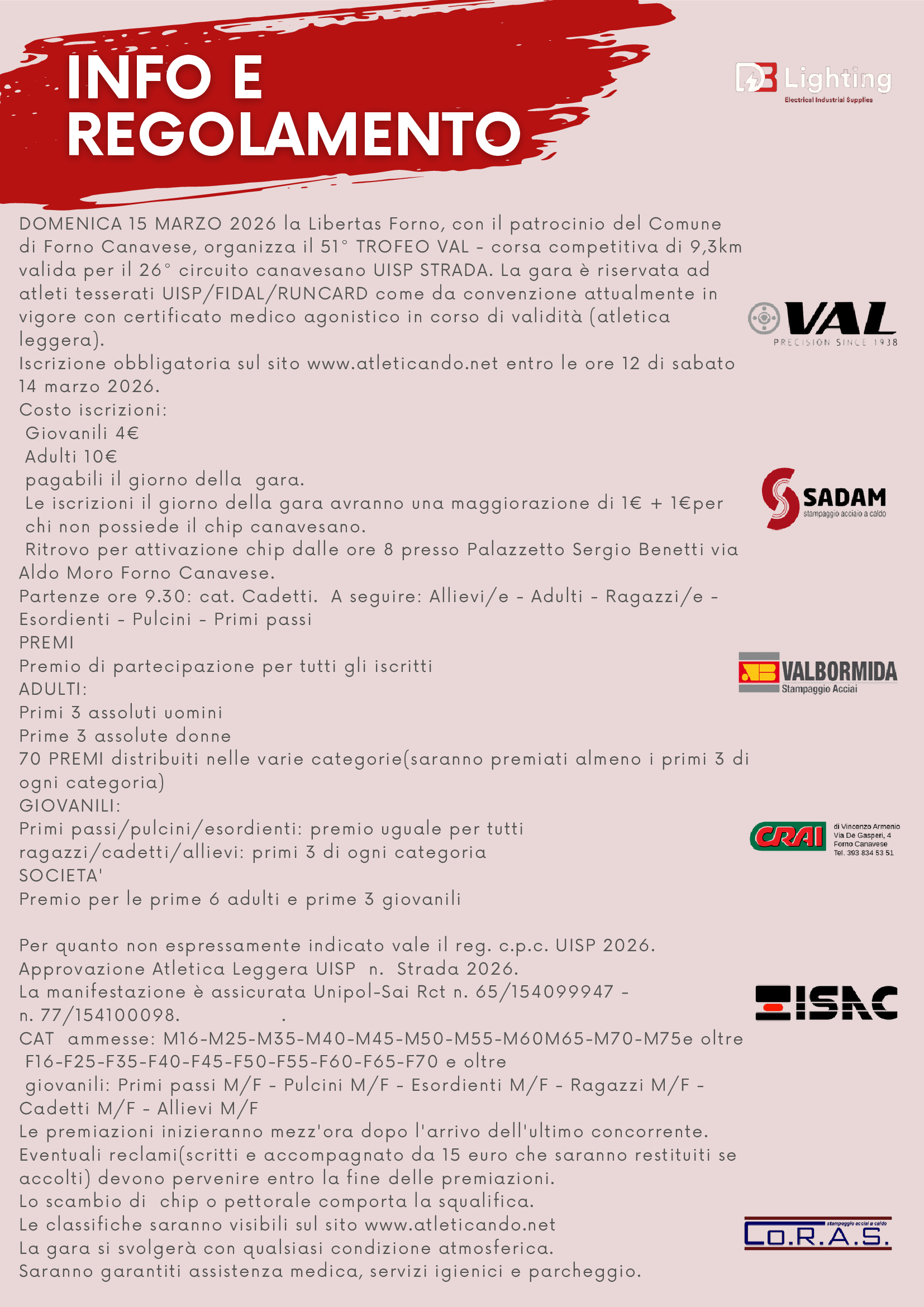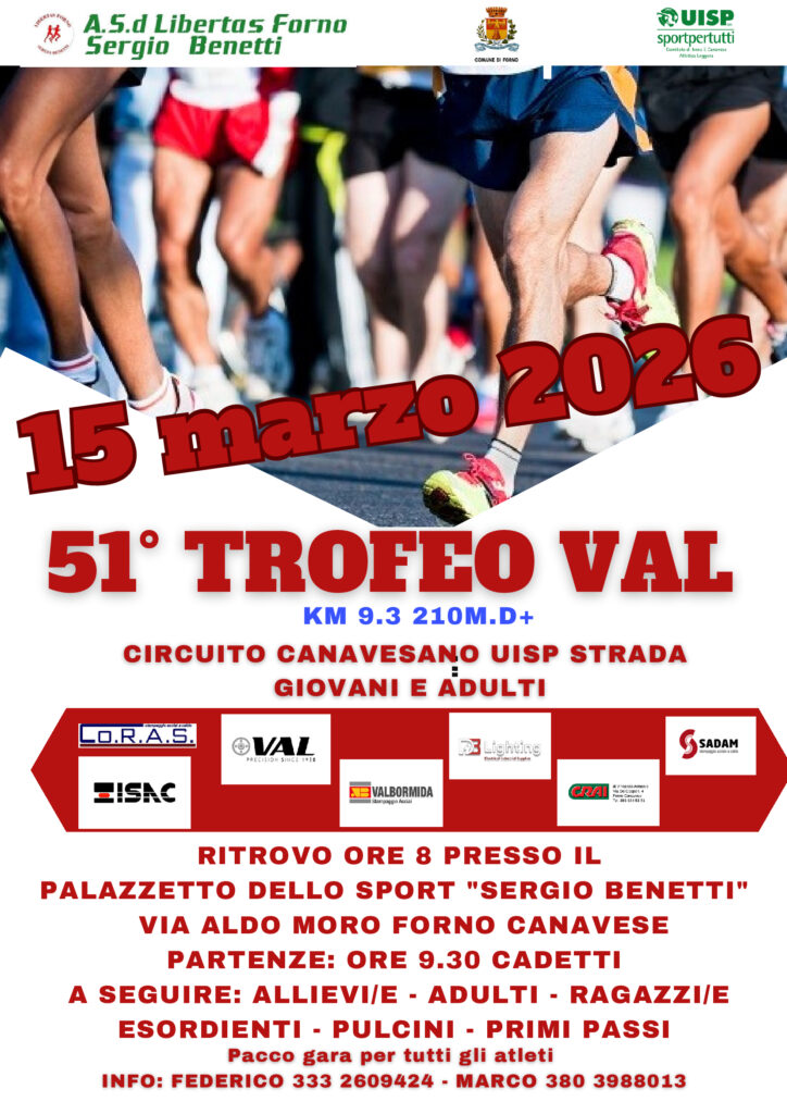 51° Trofeo Giuseppe Val Data: 15/03/2026 Località: Forno Canavese (To) 🏆 📌 Luogo: Piemonte / Torino⏰ Orario: 9,50📏 Distanza (max): 9.3 km📍 Indirizzo: Palazzetto dello Sport Sergio Benetti forno canavese torinoDescrizione: Km 9,30 +210d Volantino / Regolamento