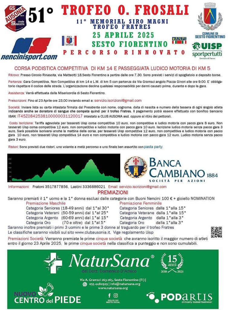 51° Trofeo Oliviero Frosali Data: 25/04/2025 Località: Firenze (FI) 🏆 🏅 Classifica: Clicca qui 📌 Luogo: Toscana / Firenze⏰ Orario: 09:00📍 Indirizzo: Circolo Rinascita, via Matteotti 18 sesto fiorentino🔗 Sito: http://www.clubausonia.it/📧 Email: info@clubausonia.it📞 Telefono: 351.7877856 Volantino / Regolamento