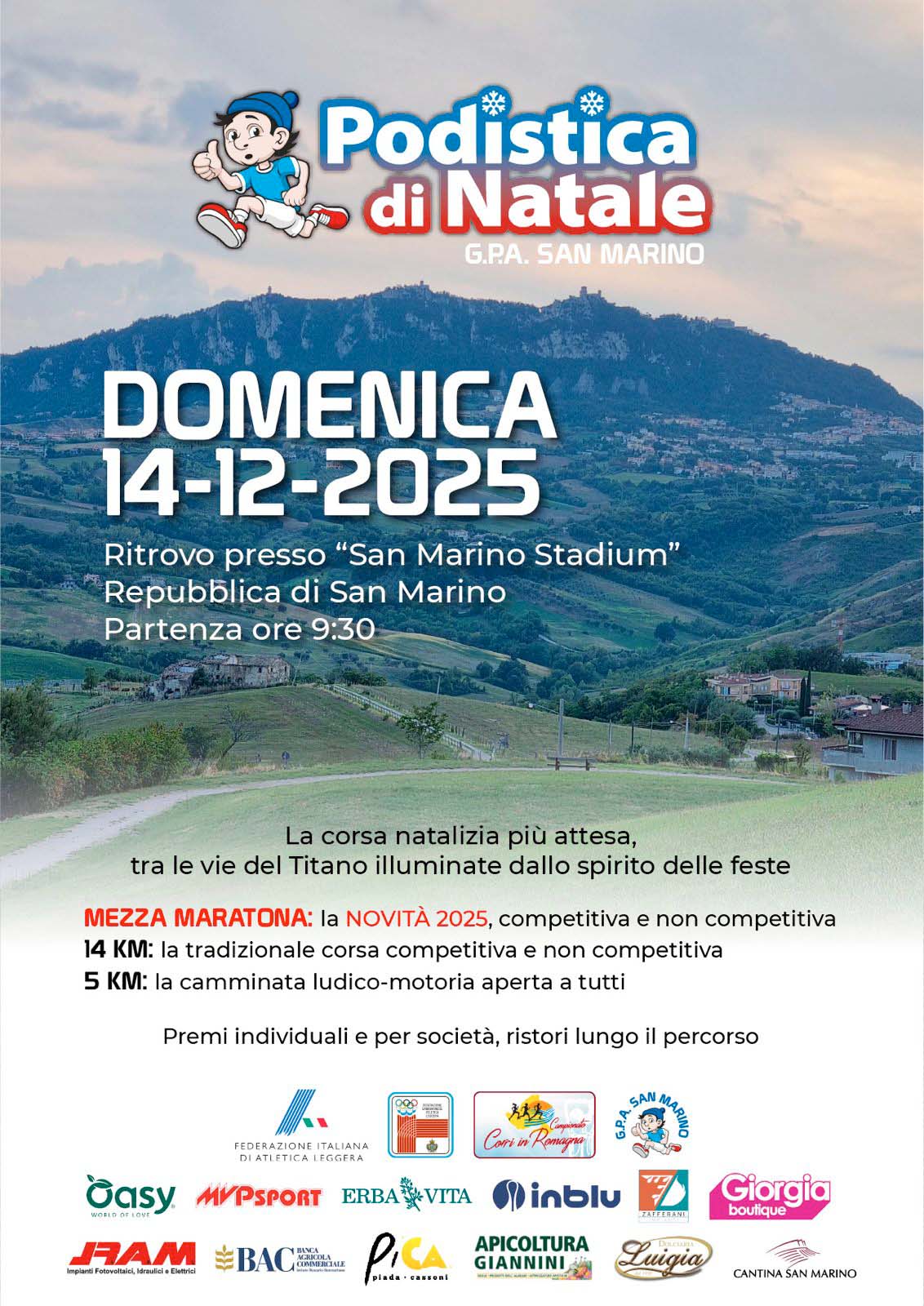 Descrizione: Competitiva e non di Km 21 e Km 14 e ludico motoria di Km 5. Partenza ore 09:30 c/o San Marino Stadium, via Rancaglia 20