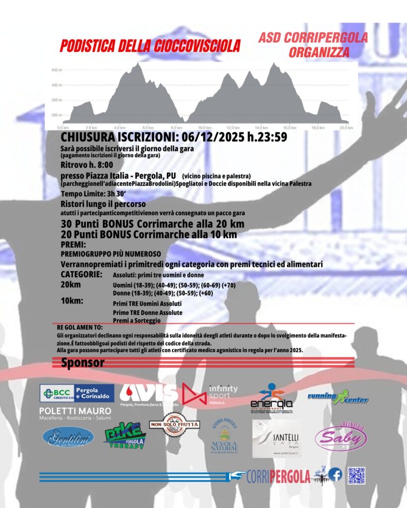 Descrizione: Competitiva di Km 20 (D+600m) e Km 10 (D+250m) e non compet./camminata di Km 10. Partenza ore 09:30 c/o Piazza Italia