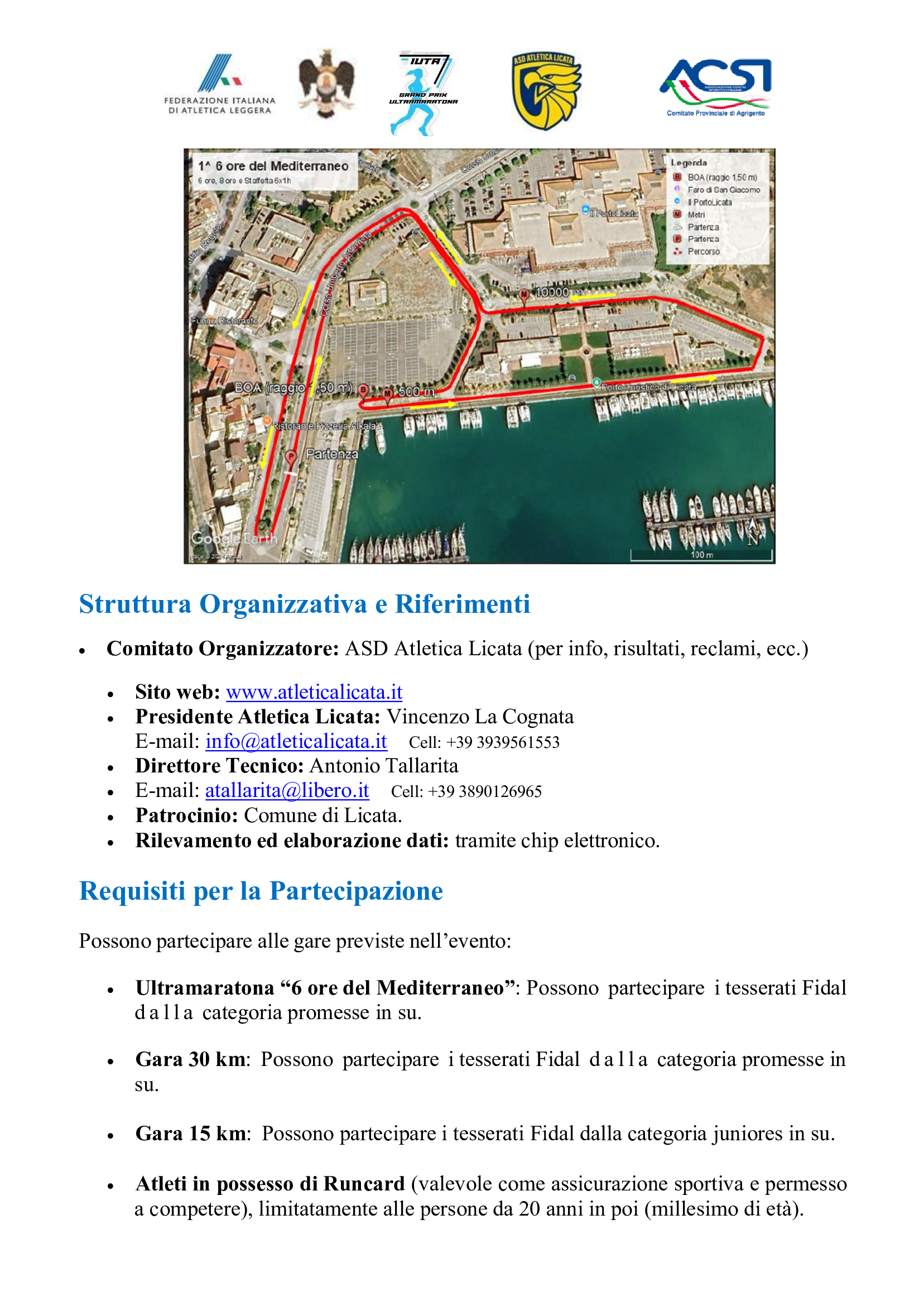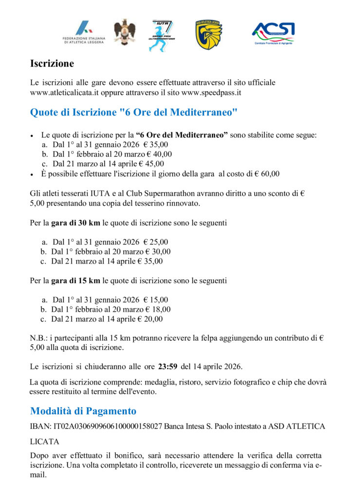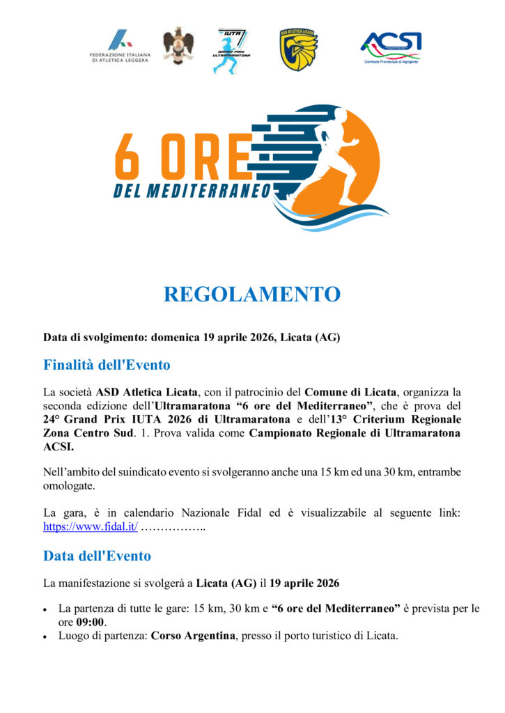 6 ore del Mediterraneo Licata (15-30Km-6ore) Data: 19/04/2026 Località: Licata (Ag) 🏆 📌 Luogo: Sicilia / Agrigento📍 Indirizzo: Licata, Agrigento, Sicilia, 92027, ItaliaDescrizione: Km 15 - Km 30 - 6 ore Volantino / Regolamento