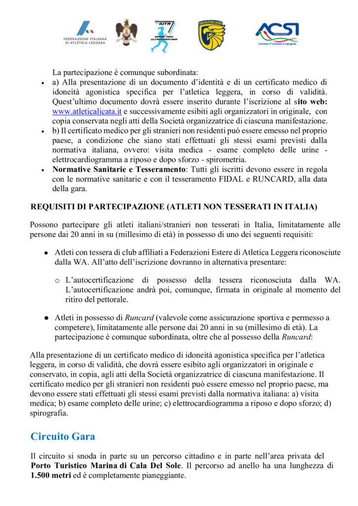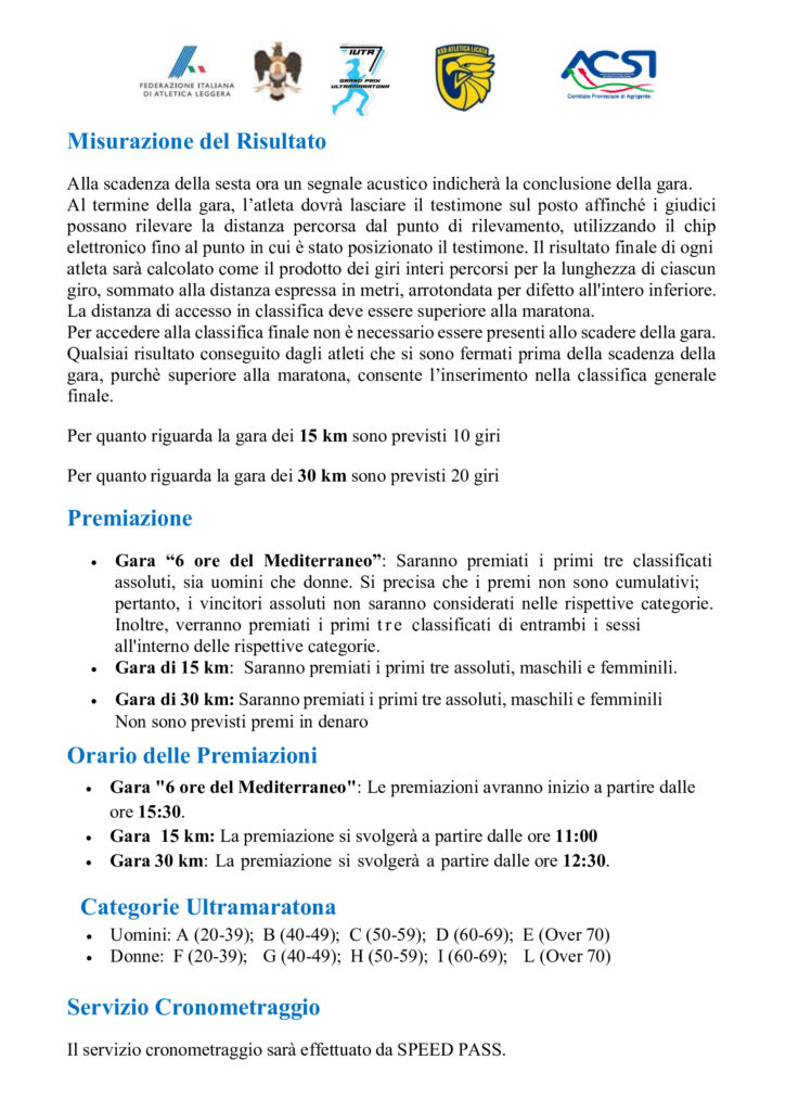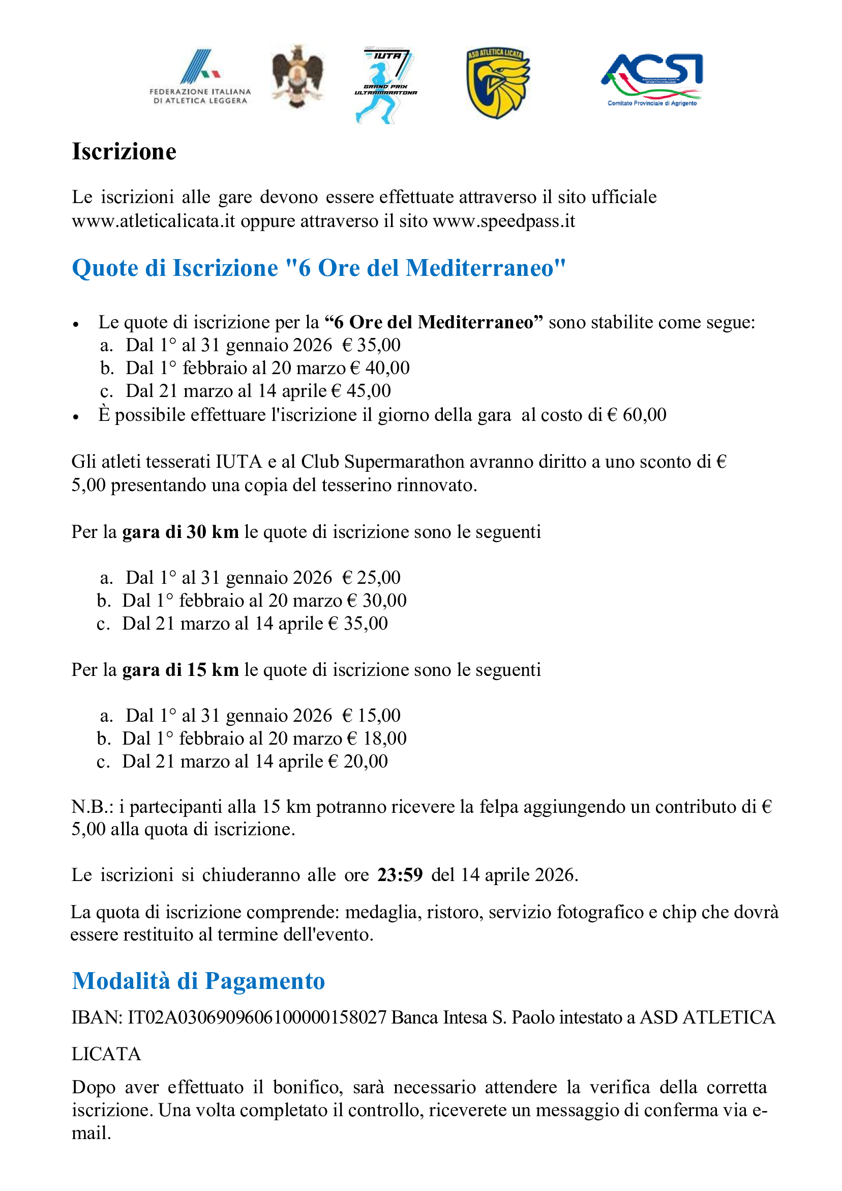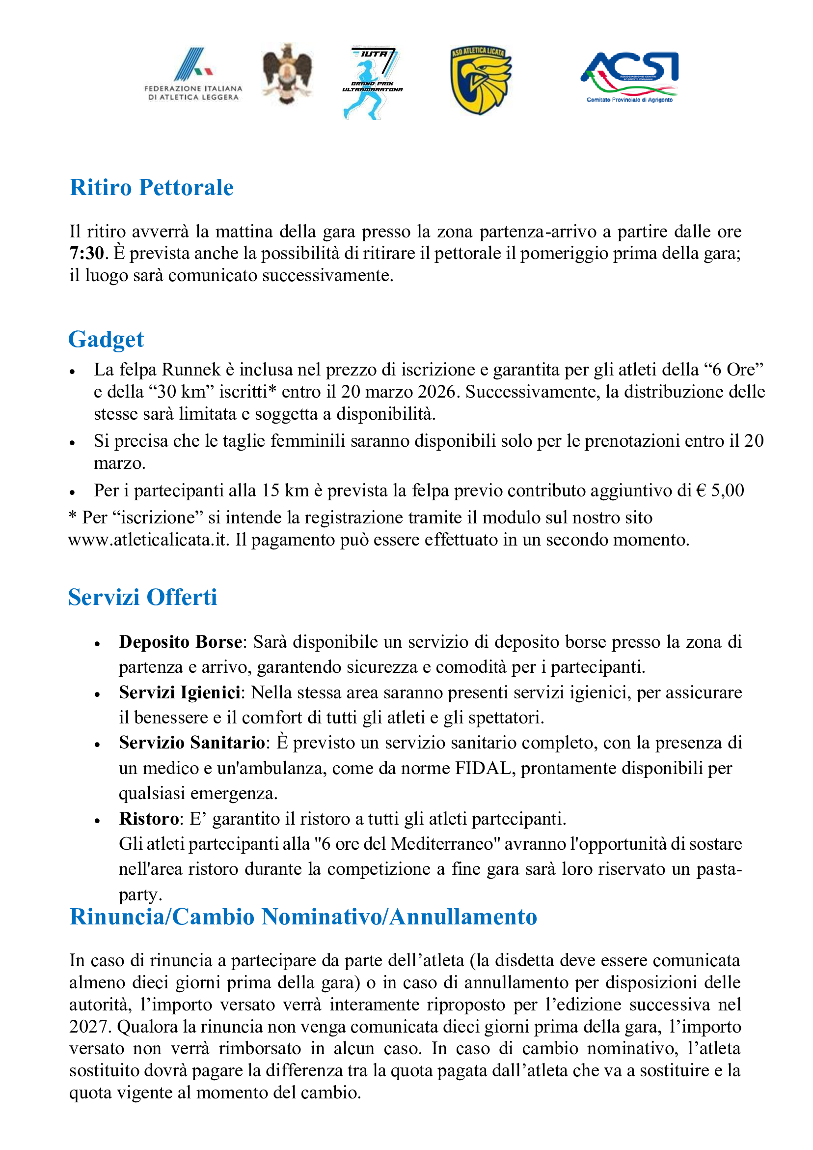 6 ore del Mediterraneo Licata (15-30Km-6ore) Data: 19/04/2026 Località: Licata (Ag) 🏆 📌 Luogo: Sicilia / Agrigento📍 Indirizzo: Licata, Agrigento, Sicilia, 92027, ItaliaDescrizione: Km 15 - Km 30 - 6 ore Volantino / Regolamento