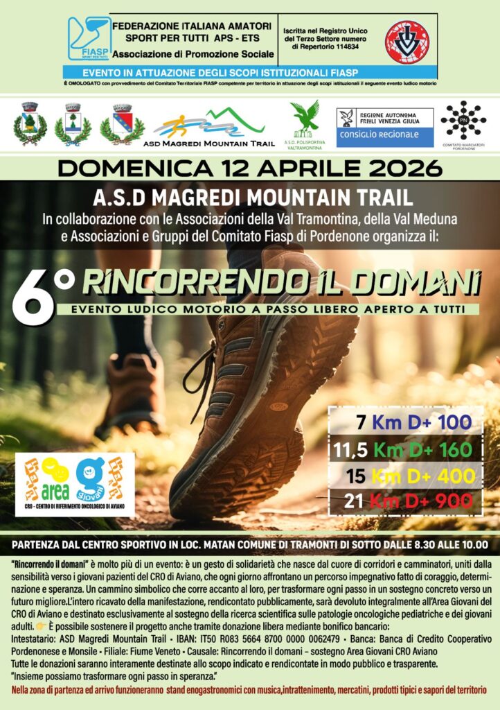 Descrizione: Ludico motoria di Km 21 (D+900m), Km 15 (D+400m), Km 11,5 (D+160m) e Km 7 (D+100m). Partenza ore 08:30/10:00 c/o il Centro Sportivo in località Matan