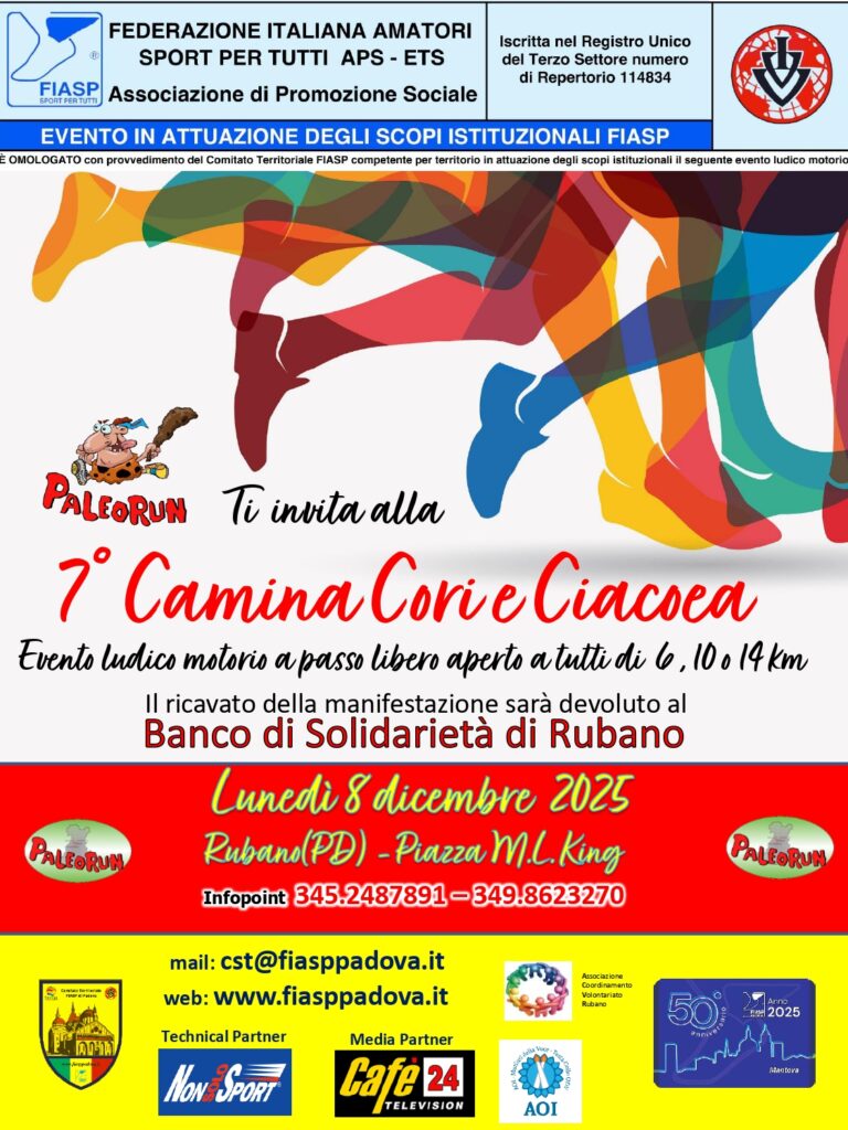 7° Camina, Cori e Ciacoea Data: 08/12/2025 Località: Rubano (Pd) 📌 Luogo: Veneto / Padova📏 Distanza (max): 14 km🔗 Sito: www.paleorun.it📧 Email: info@paleorun.it📞 Telefono: 345.2487891 - 349.8623270Descrizione: Ludico motoria di Km 14 - 10 - 6. Partenza da Piazza Martin Luther King Volantino / Regolamento