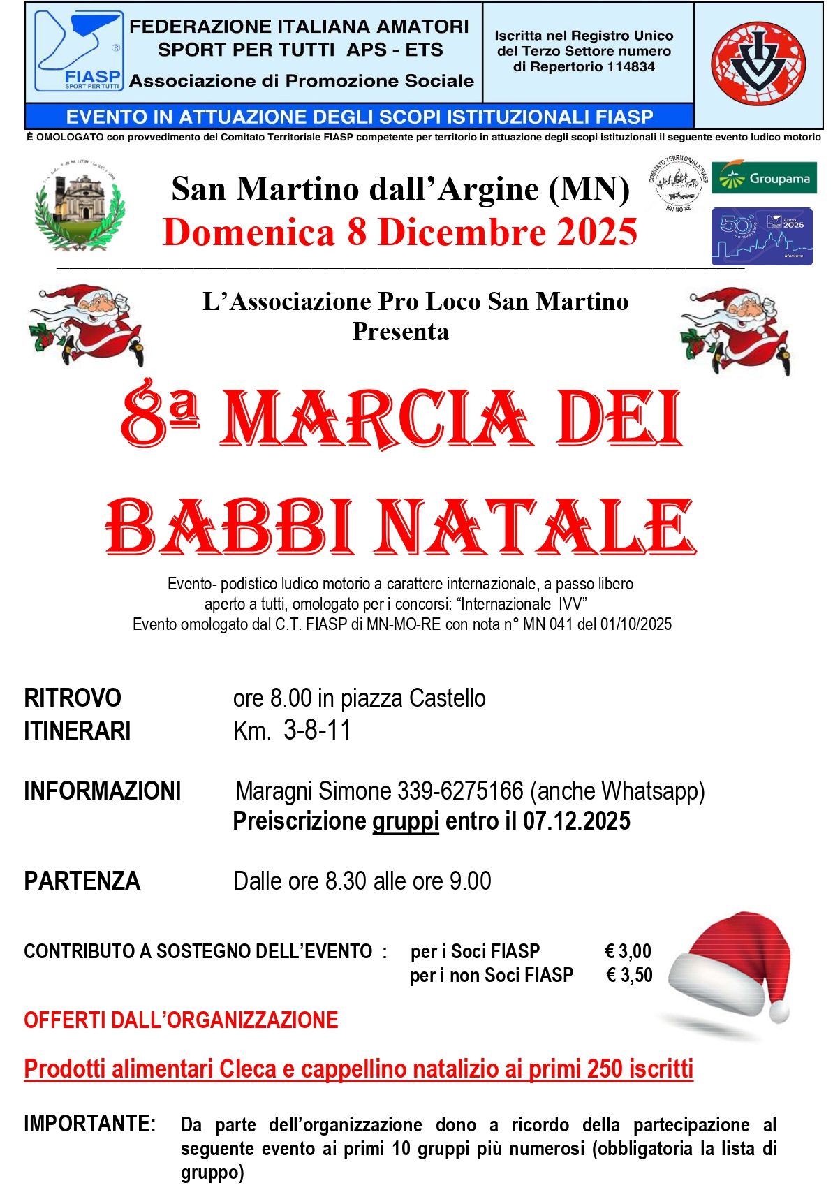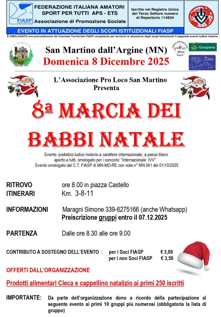 8° Marcia dei Babbi Natale Data: 08/12/2025 Località: San Martino dall'Argine (Mn) 📌 Luogo: Lombardia / Mantova📏 Distanza (max): 11 km🔗 Sito: prolocosanmartinodallargine.wordpress.com📧 Email: prolocosanmartinodallargine@yahoo.com📞 Telefono: 339.6275166Descrizione: Ludico motoria di Km 11 - 8 - 3. Partenza ore 08:30/09:00 da Piazza Castello Volantino / Regolamento
