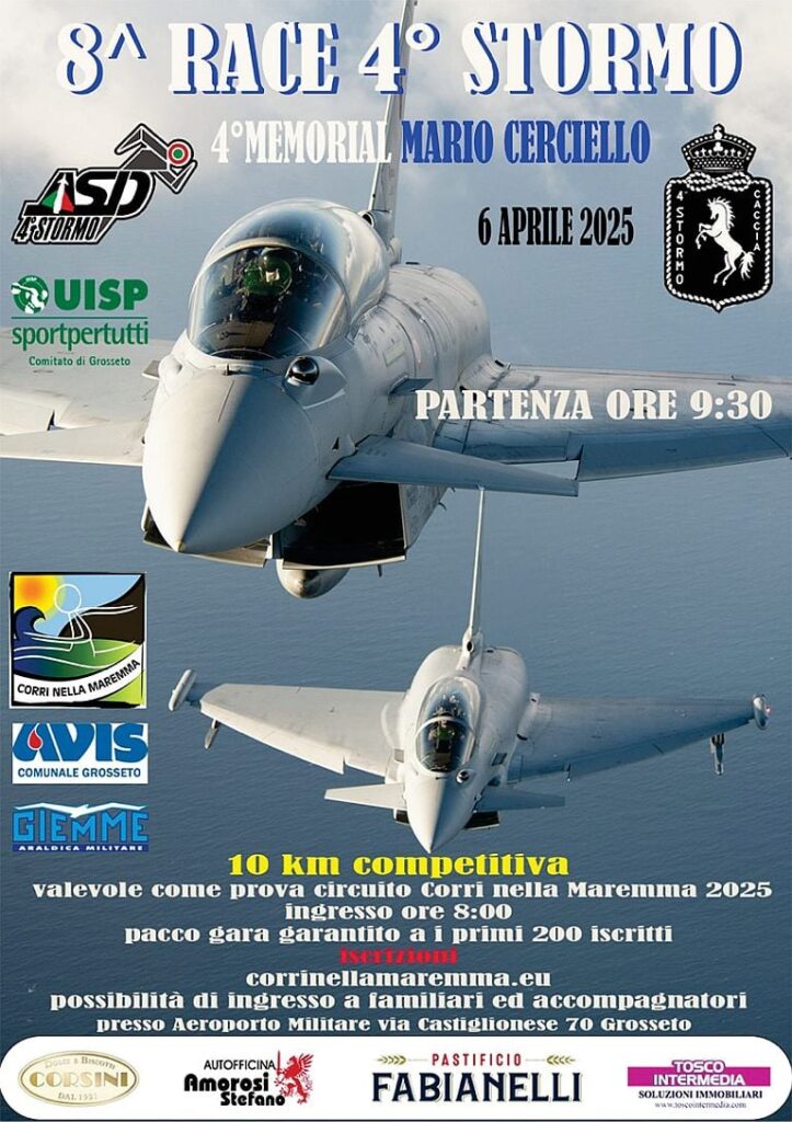 8° Race 4° Stormo Data: 06/04/2025 Località: Grosseto (GR) 🏅 Classifica: Clicca qui 📌 Luogo: Toscana / Grosseto⏰ Orario: 09:30📍 Indirizzo: Base Militare, ingresso da Via Castiglionese 70🔗 Sito: http://www.facebook.com/asd4stormo📧 Email: fabioemb@fastwebnet.it Volantino / Regolamento