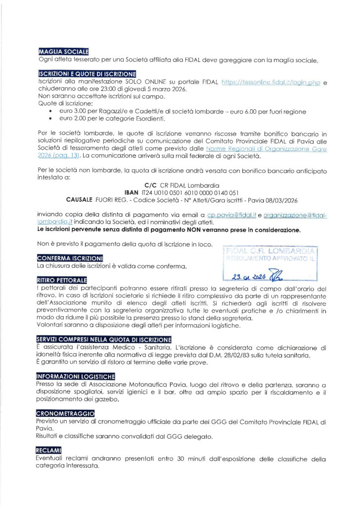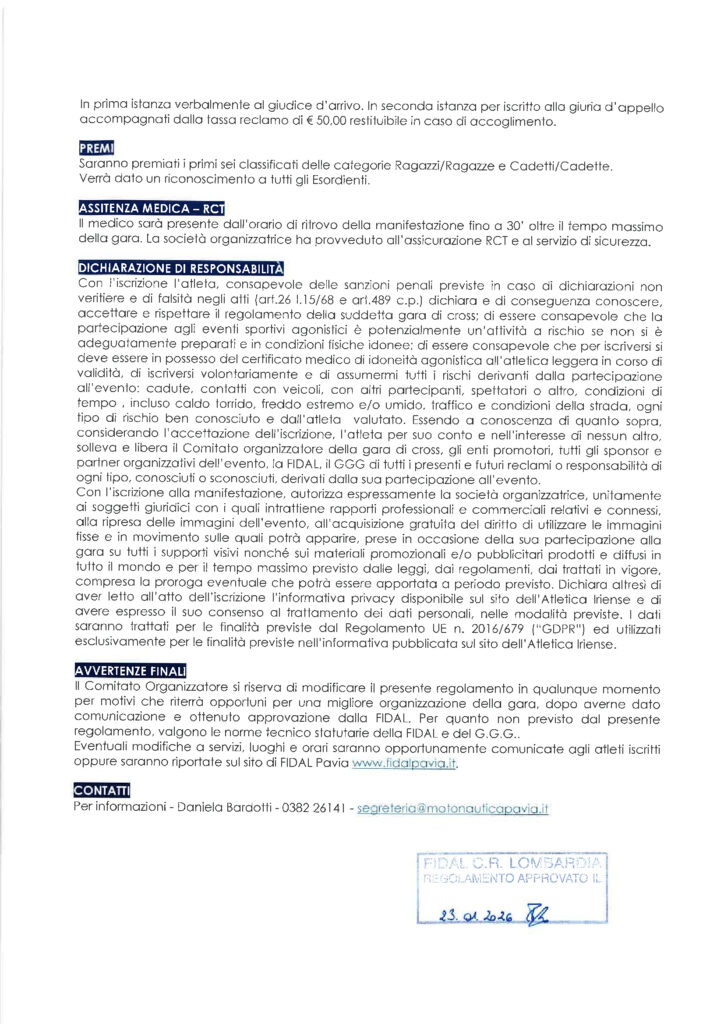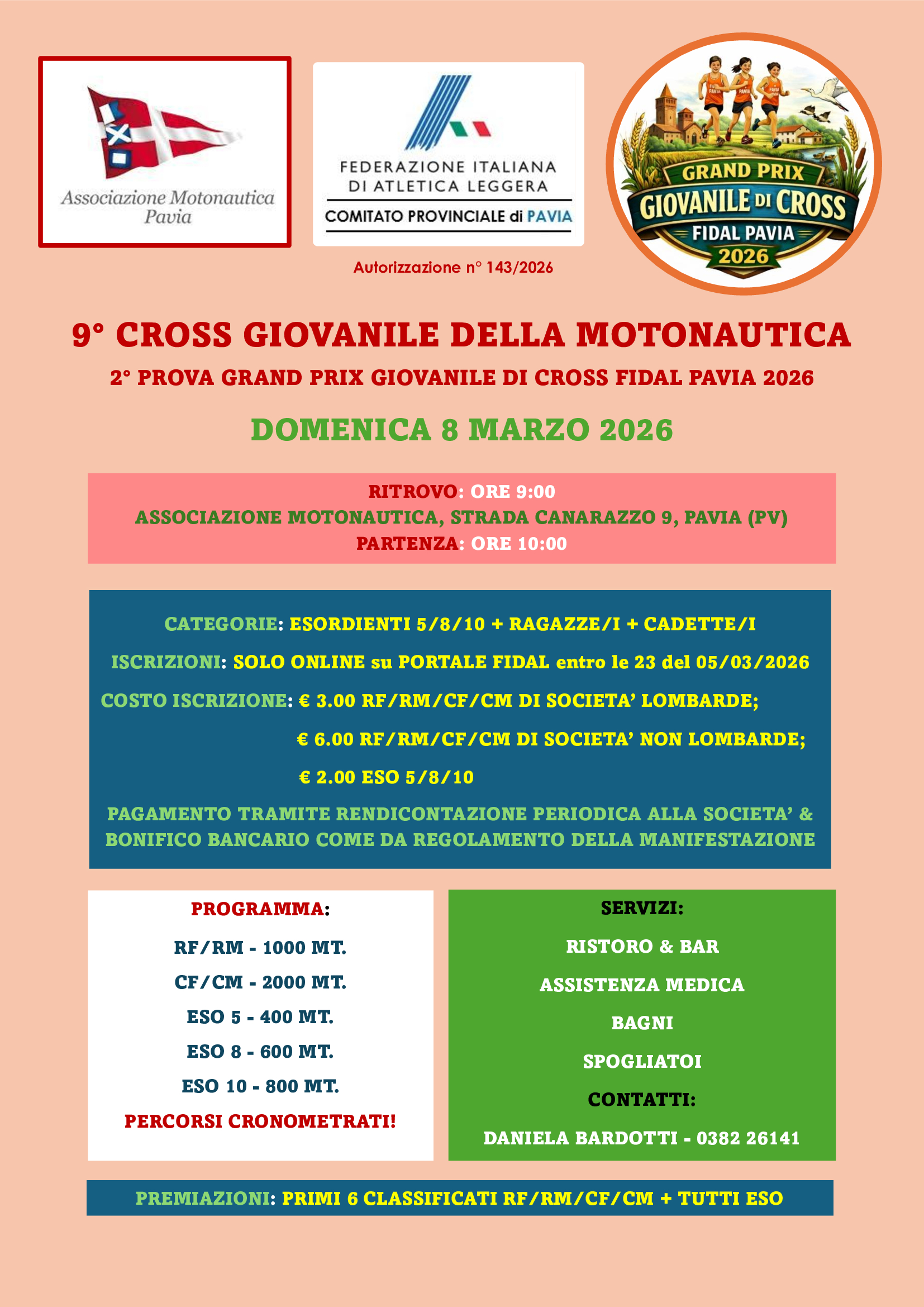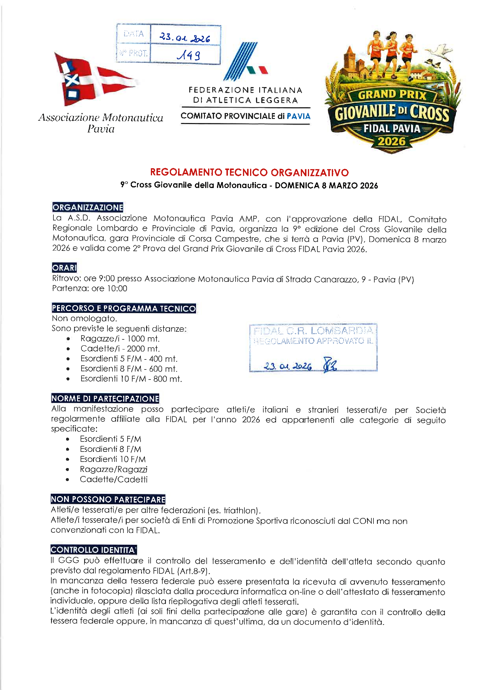 9° Cross Giovanile della Motonautica Data: 08/03/2026 Località: Pavia (Pv) 🏆 📌 Luogo: Lombardia / Pavia📍 Indirizzo: Pavia, Lombardia, ItaliaDescrizione: distanze diverse per categorie Volantino / Regolamento