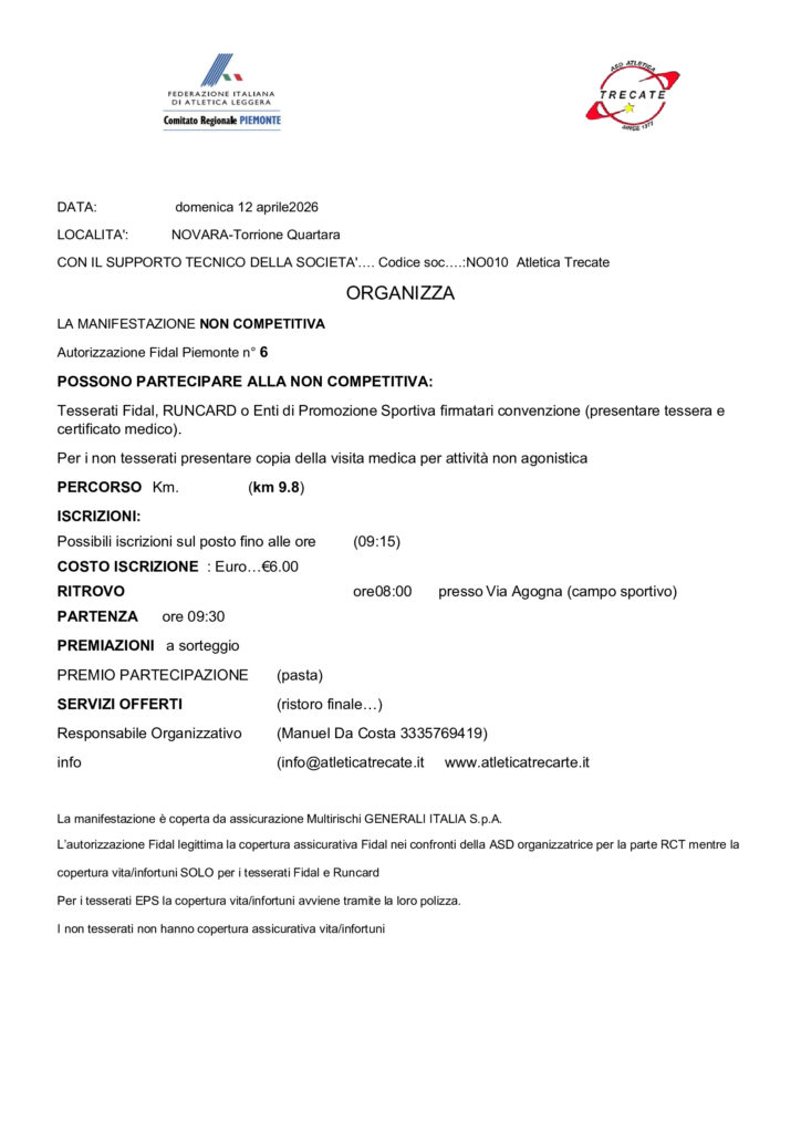 Descrizione: Non competitiva di Km 10. Partenza ore 09:30 da via Agogna c/o il campo da calcio