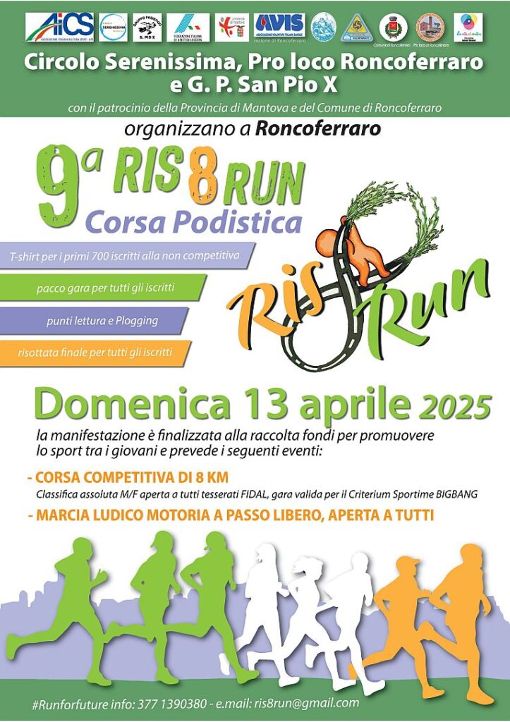 9° Ris8Run Data: 13/04/2025 Località: Mantova (MN) 🏆 🏅 Classifica: Clicca qui 📌 Luogo: Lombardia / Mantova⏰ Orario: 08:30📍 Indirizzo: Via Leonardo Da Vinci roncoferraro🔗 Sito: http://www.facebook.com/profile.php?id=100053603096662📧 Email: ris8run@gmail.com📞 Telefono: 377.1390380 Volantino / Regolamento