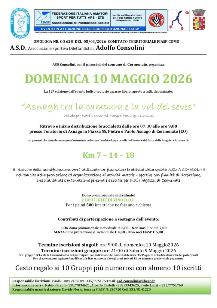 Descrizione: Ludico motoria di Km 18 - 14 - 7. Partenza ore 07:30/09:00 c/o l'Oratorio in Piazza SS. Pietro e Paolo