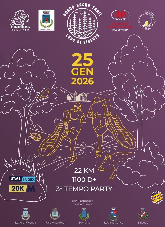 Bosco Sacro Trail Data: 25/01/2026 Località: Lugo (VI) 🏆 📌 Luogo: Veneto / Vicenza⏰ Orario: 9,30📏 Distanza (max): 22 km🔗 Sito: https://www.boscosacrotrail.it/Descrizione: km 22 d+1100 Volantino / Regolamento Apri