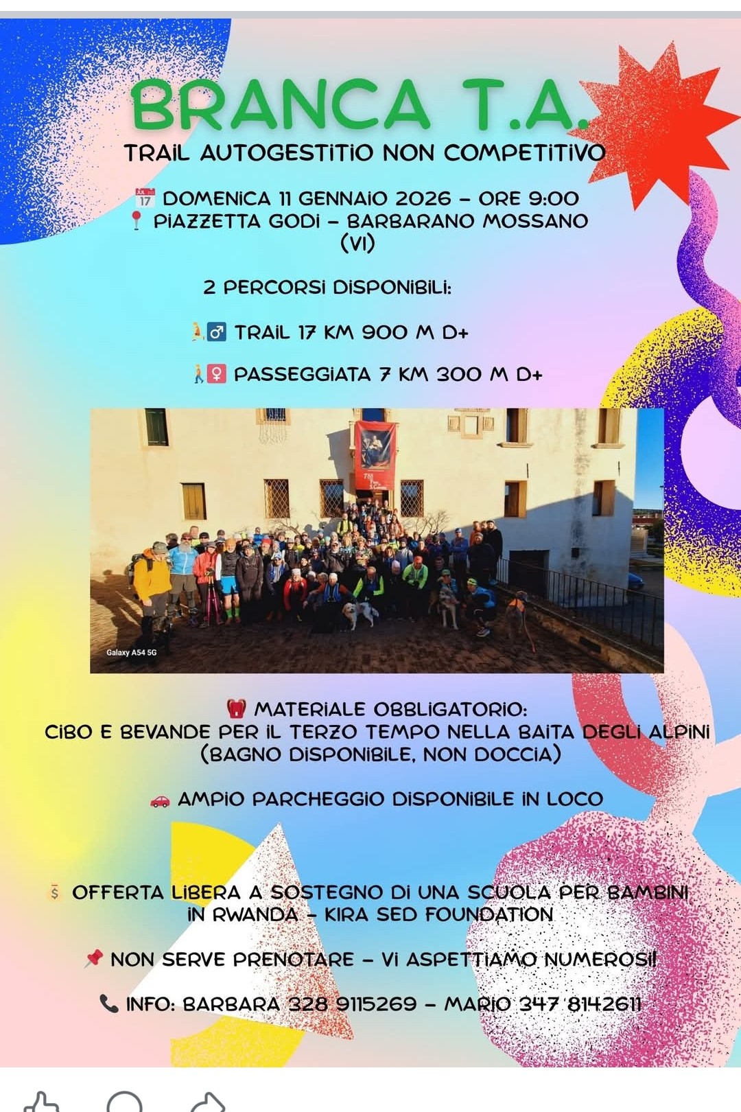 Branca T.A. Trail Autogestito Data: 11/01/2026 Località: Barbarano Mossano (VI) 📌 Luogo: Veneto / Vicenza⏰ Orario: 9,00📏 Distanza (max): 17 km📍 Indirizzo: Piazzetta Godi Barbarano Mossano (Vi)Descrizione: Trail 17 km +900 D Km 7 + 300 D Volantino / Regolamento