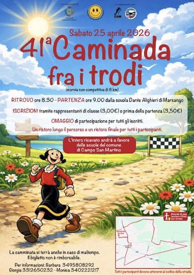 41° Caminada fra i Trodi Data: 25/04/2026 Località: Marsango di Campo San Martino (Tv) 📌 Luogo: Veneto / Treviso⏰ Orario: 9📏 Distanza (max): 8 km📍 Indirizzo: Marsango, Campo San Martino, Padova, Veneto, 35010, ItaliaDescrizione: Km 8 Volantino / Regolamento