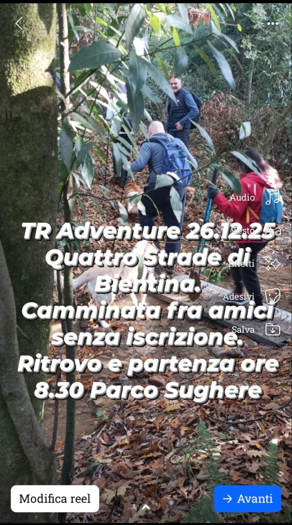 Descrizione: Camminata tutta nei boschi fra amici di 10 km , partenza ore 8.30 dal Parco Le Sughere, nessun costo, nessuna iscrizione.