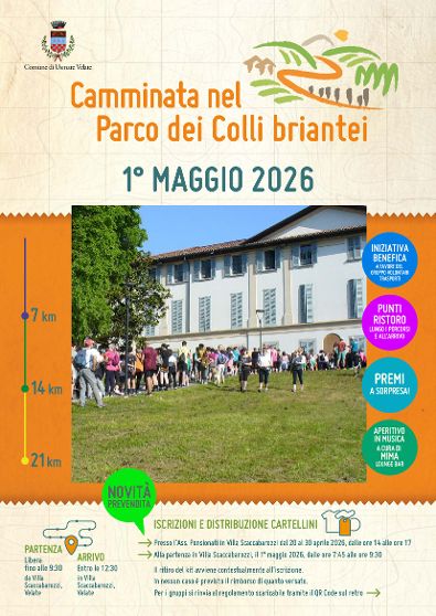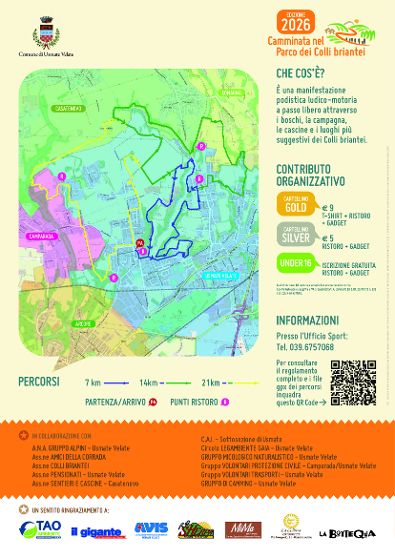 Descrizione: Camminata non competitiva a passo libero con tre diversi percorsi di 7, 14 e 21 km attraverso i boschi, la campagna, le cascine e i luoghi più suggestivi dei Colli briantei con partenza e arrivo in Villa Scaccabarozzi a Velate.