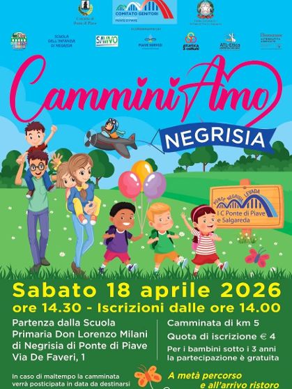 CamminiAmo Data: 18/04/2026 Località: Negrisia (Tv) 📌 Luogo: Veneto / Treviso⏰ Orario: 14,30📏 Distanza (max): 5 km📍 Indirizzo: Via de Faveri Negrisia, Ponte di Piave, Treviso, Veneto, 31047, ItaliaDescrizione: Km 5 ludico motoria Volantino / Regolamento