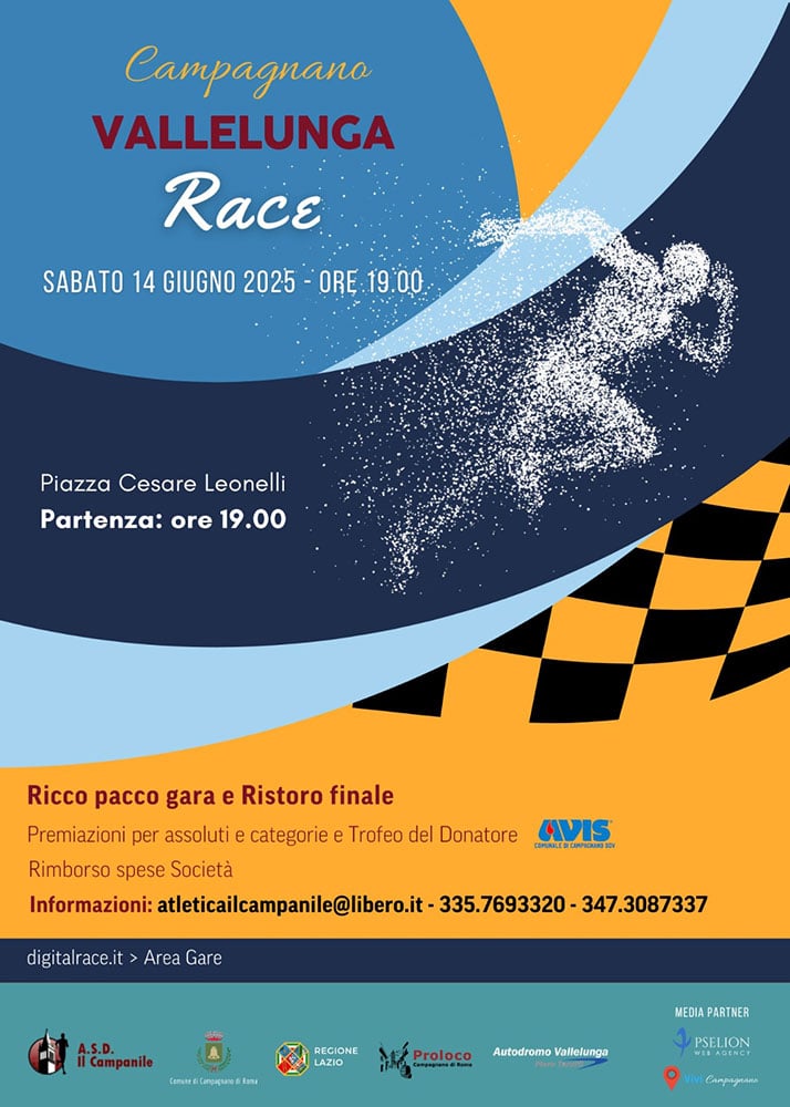 Campagnano Vallelunga Race Data: 14/06/2025 Località: Roma (RM) 🏅 Classifica: Clicca qui 📌 Luogo: Lazio / Roma⏰ Orario: 19:00📍 Indirizzo: Piazza cesare Leonelli campagnano📧 Email: atleticailcampanile@libero.it📞 Telefono: 335.7693320Descrizione: Km 10 Volantino / Regolamento