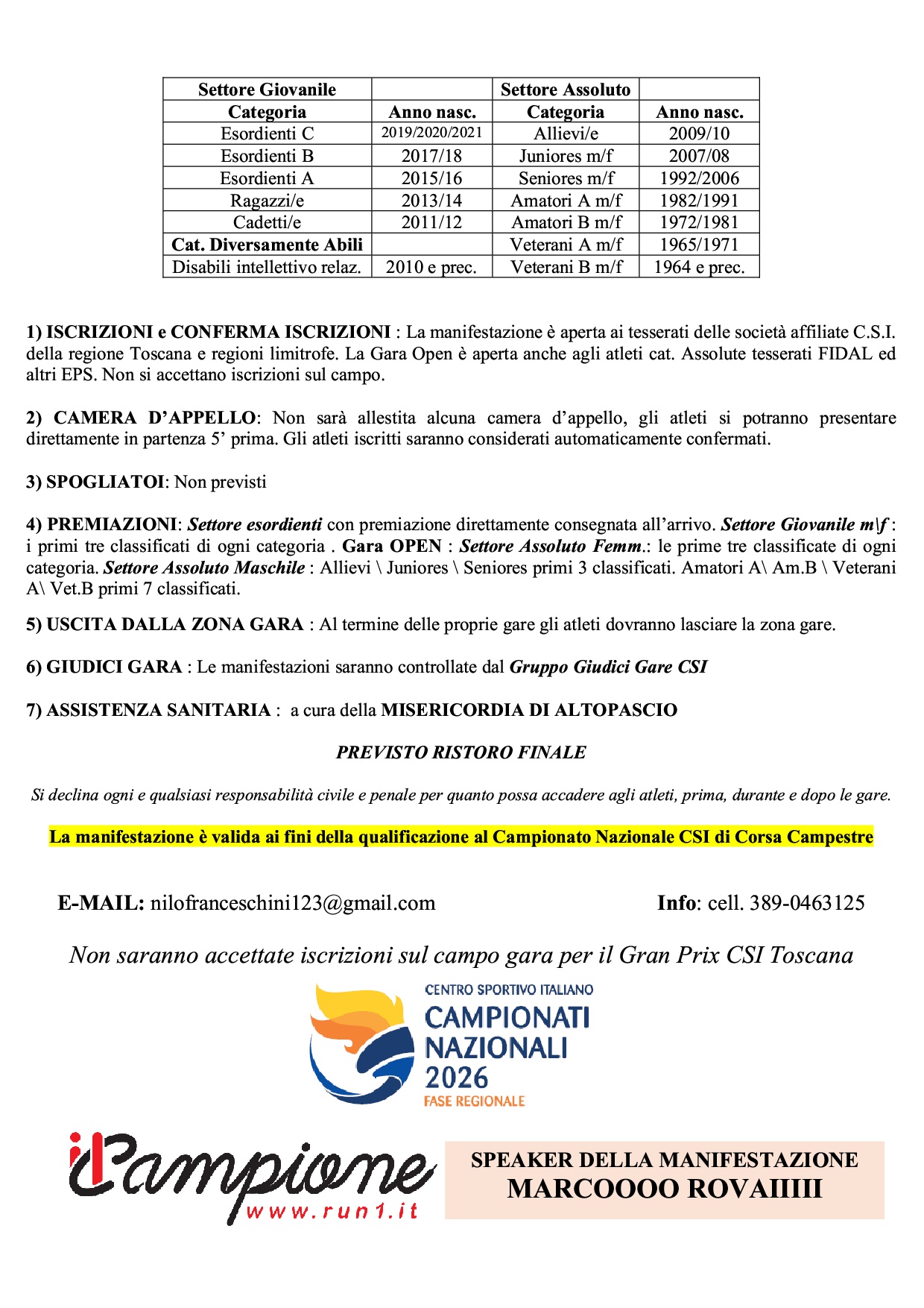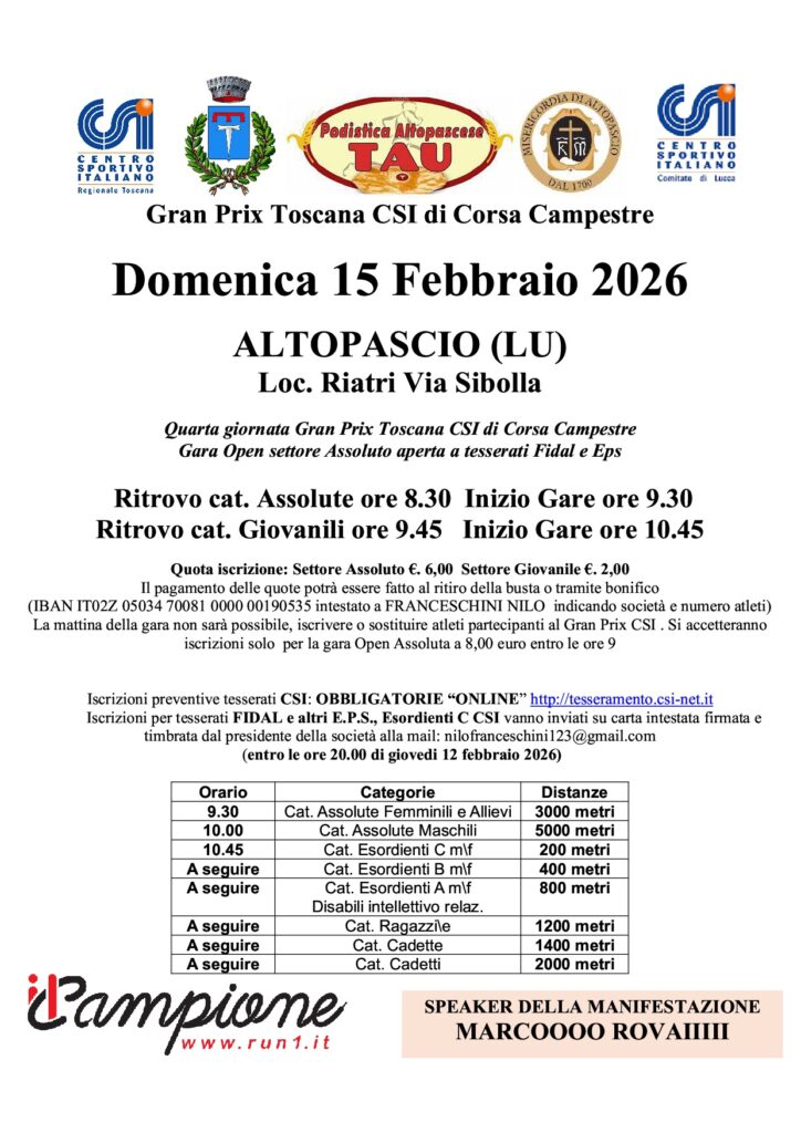 Descrizione: Campestre su varie distanze. Inizio gare ore 9,30 c/o via della Sibolla in località Riatri