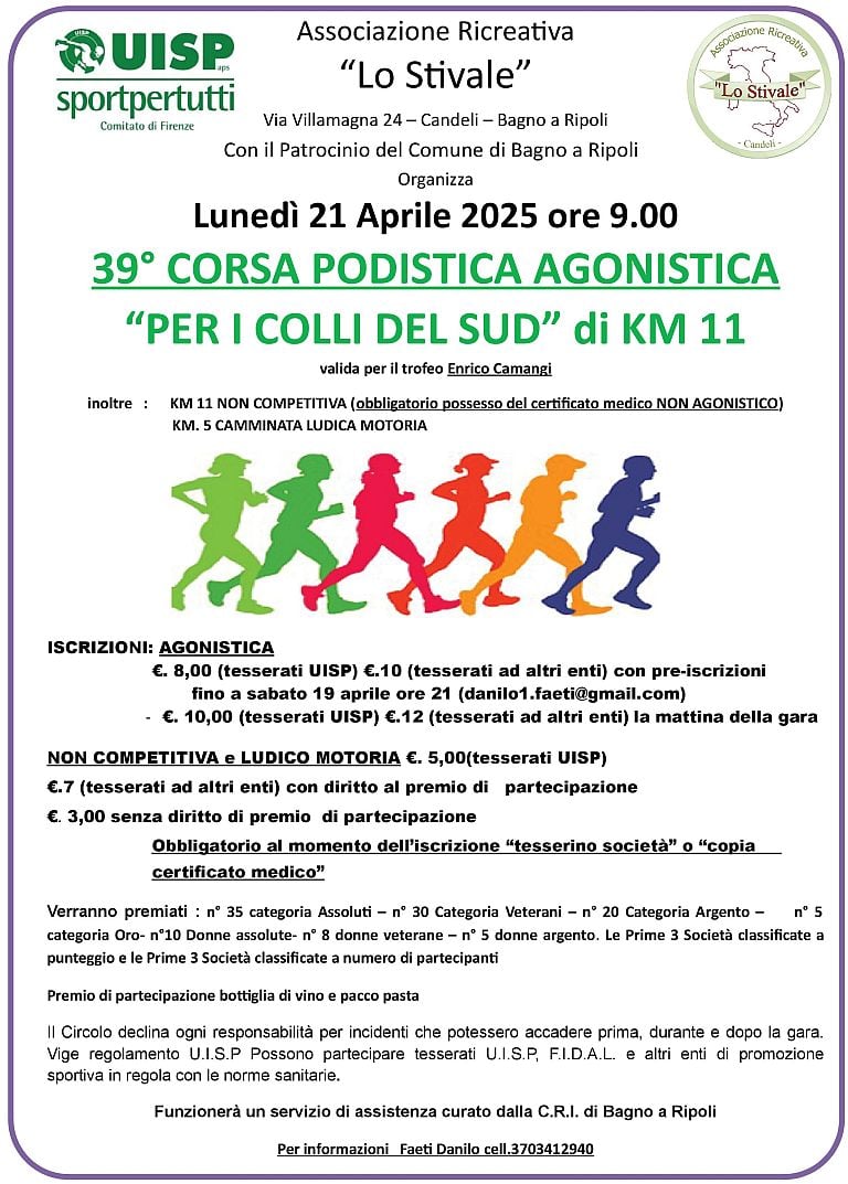 Candeli – Bagno a Ripoli (FI) – 39° Per i Colli del Sud Data: 21/04/2025 🏅 Classifica: Clicca qui ⏰ Orario: 09:00📍 Indirizzo: Circolo Lo Stivale, via Villamagna 24, Candeli📧 Email: danilo1.faeti@gmail.com📞 Telefono: 370.3412940 Volantino / Regolamento