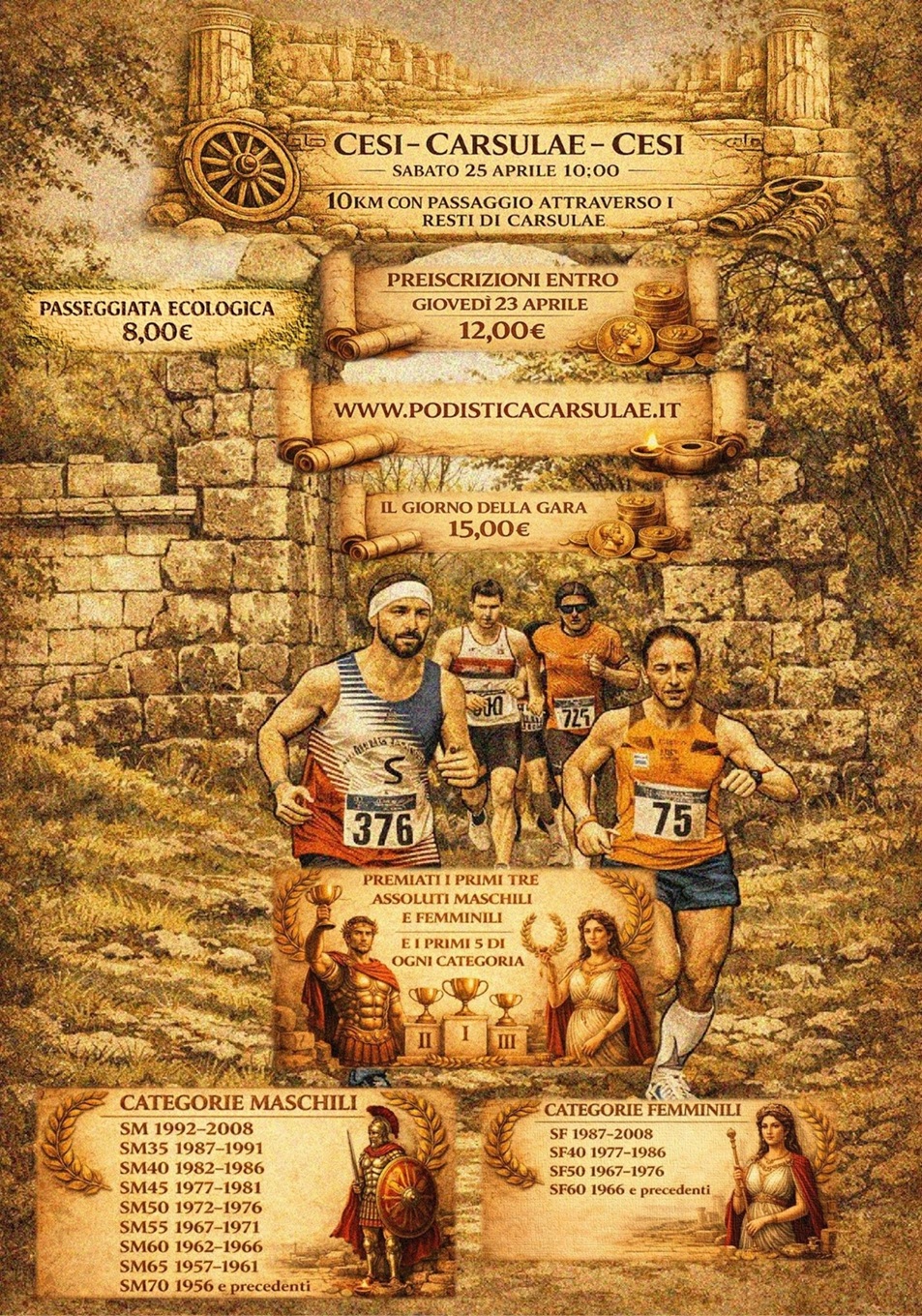 Descrizione: Gara competitiva di 10km con partenza dal borgo di Cesi, passaggio nell’area archeologica di Carsulae e ritorno al borgo di Cesi.
