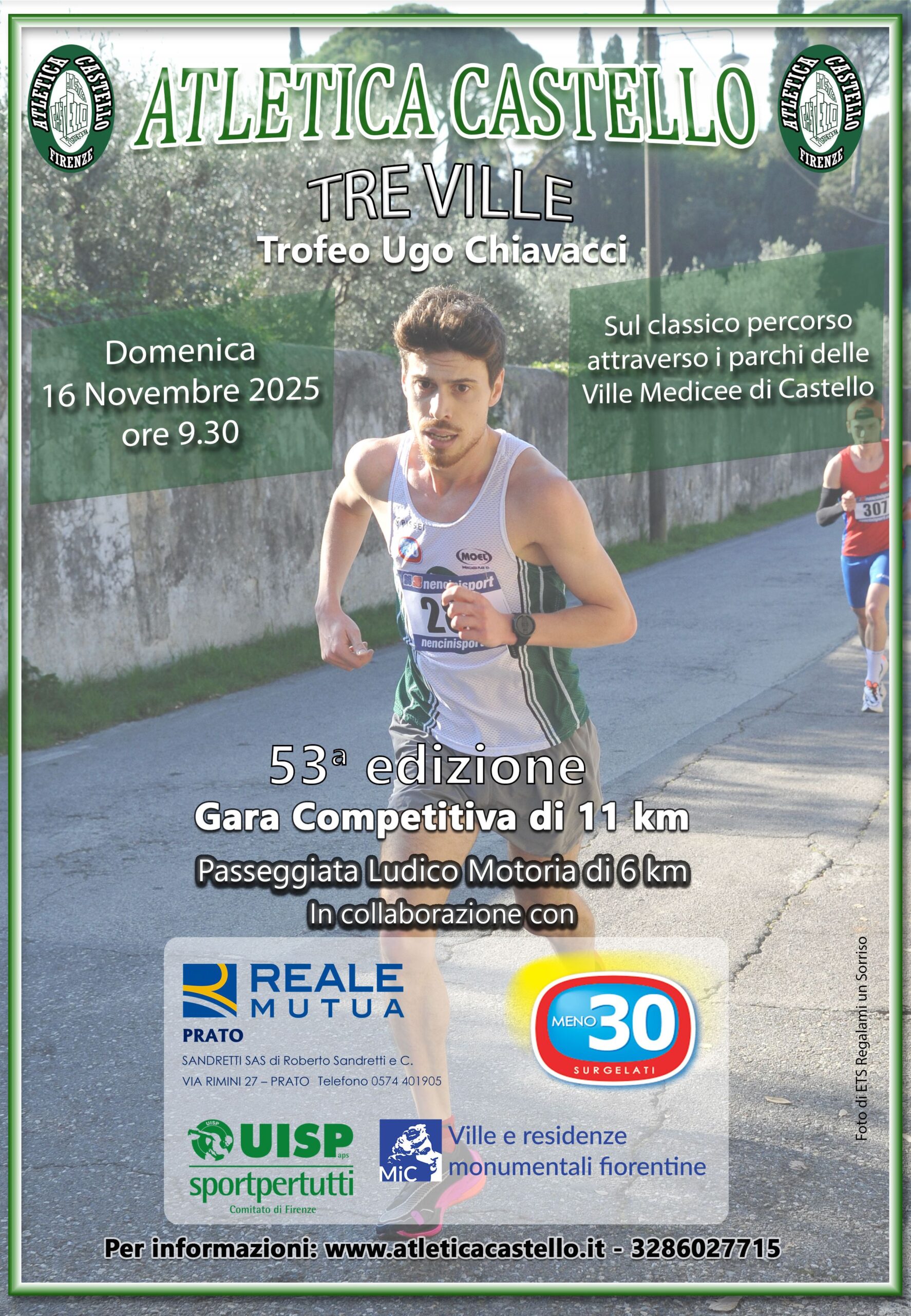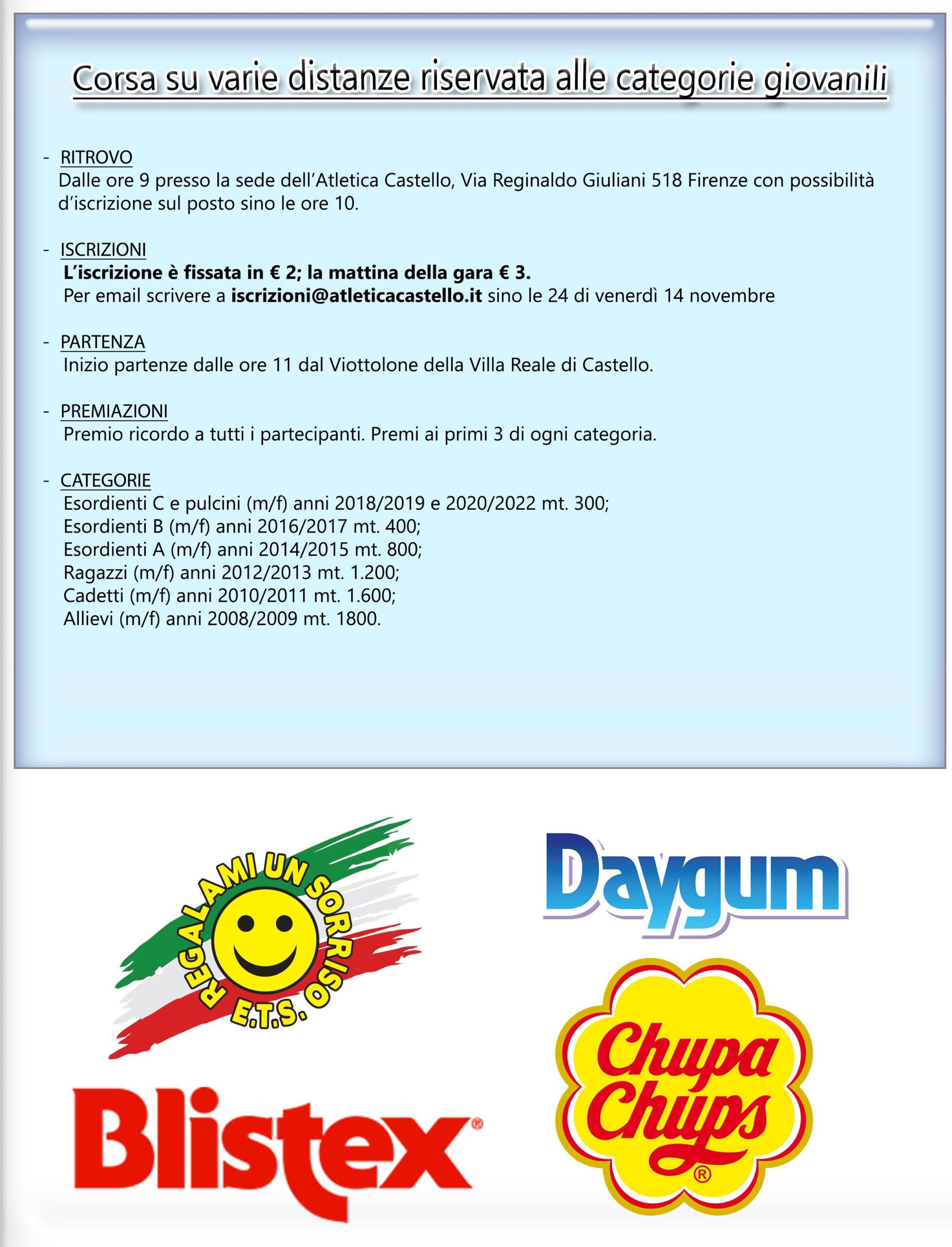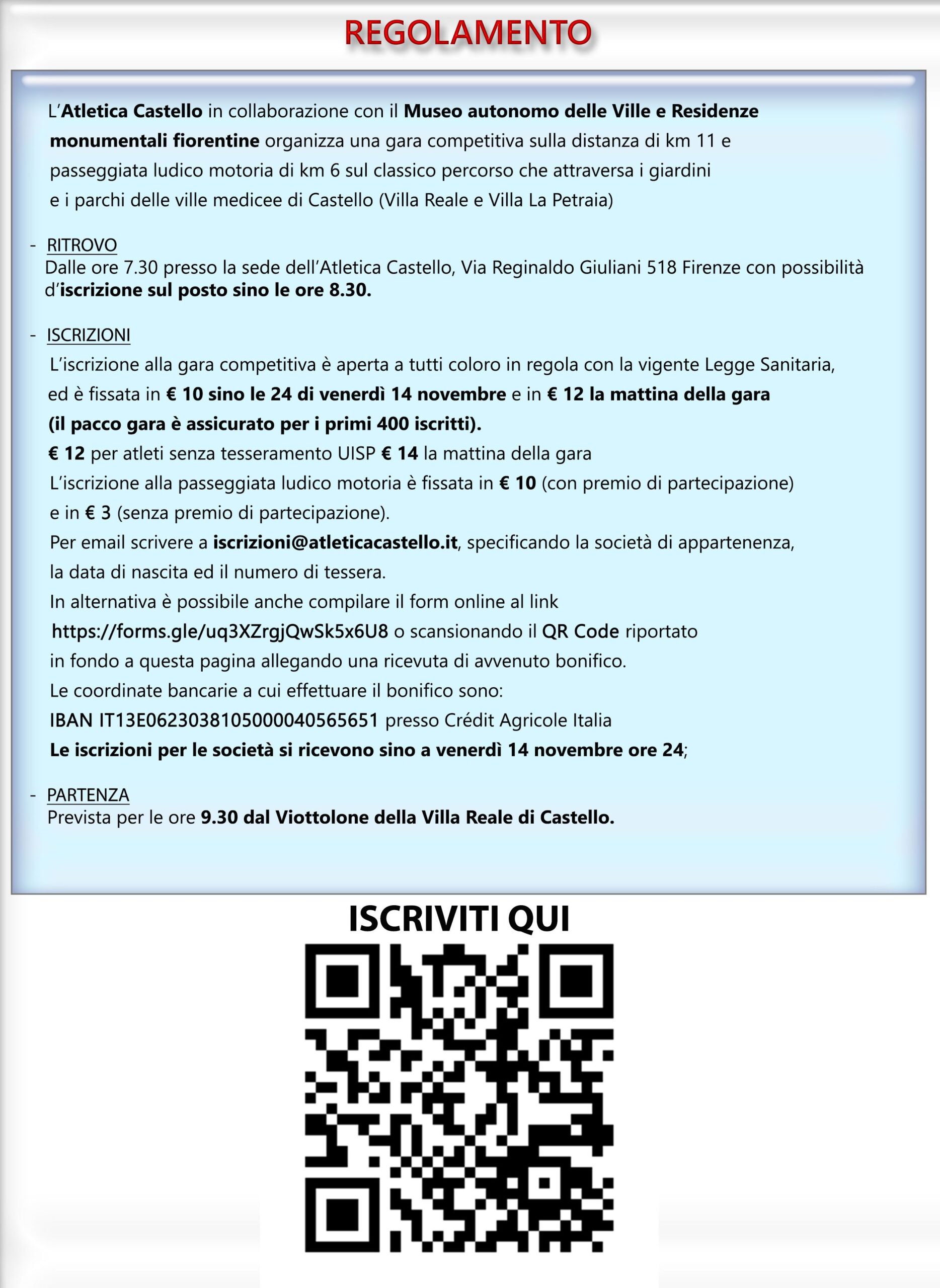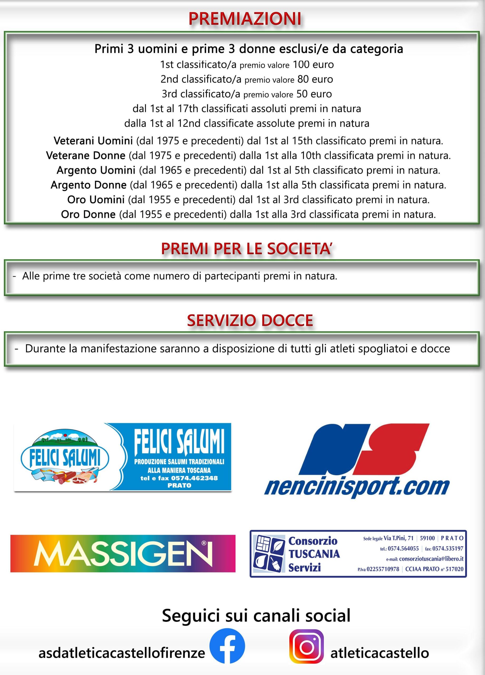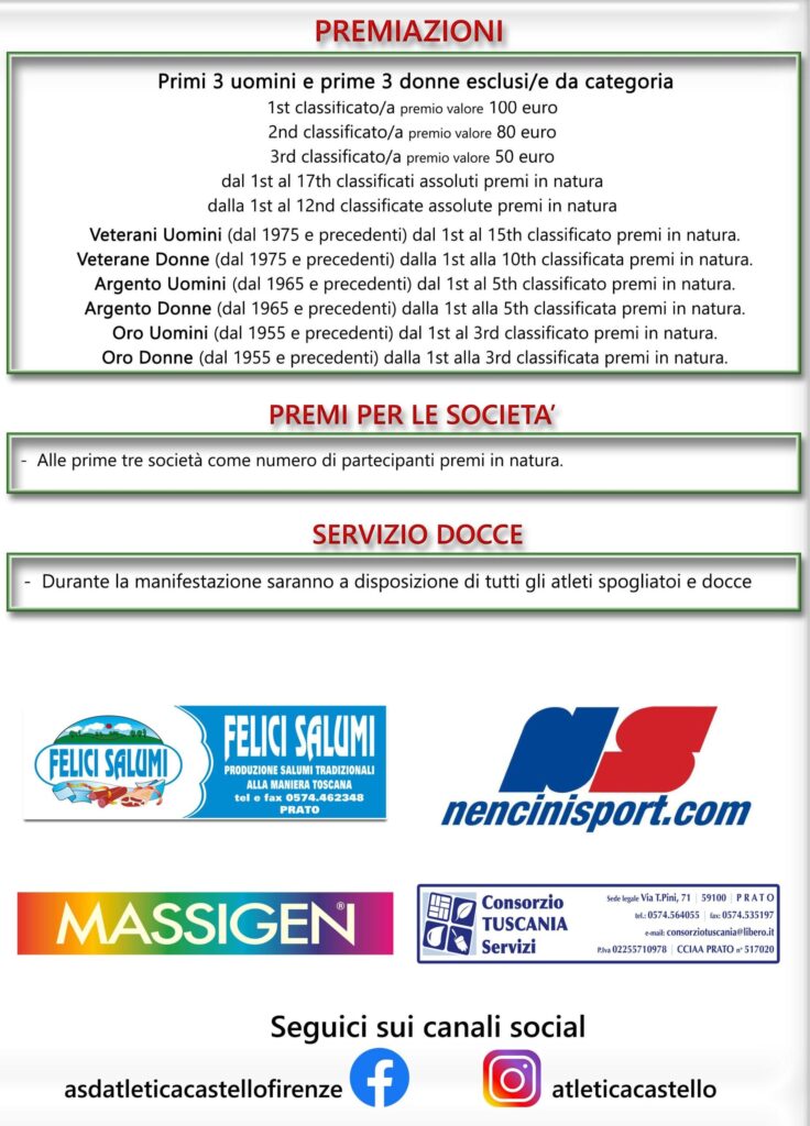 Descrizione: Competitiva di Km 10 e ludico motoria di Km 6. Partenza ore 09:30 c/o Atletica Castello, via R. Giuliani 518