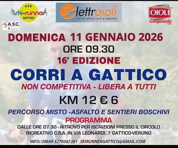 Corri a Gattico Data: 11/01/2026 Località: Gattico -Veruno 📌 Luogo: Piemonte / Novara⏰ Orario: 9,30📏 Distanza (max): 12 km📍 Indirizzo: CSA Via Leonardi 7📧 Email: skinrunnergattico@gmail.com📞 Telefono: Sig. Omar 3270307261Descrizione: Km 12 non competitiva costo 6 euro Volantino / Regolamento