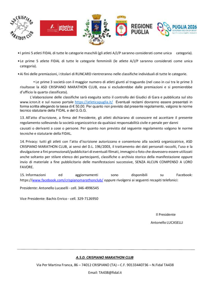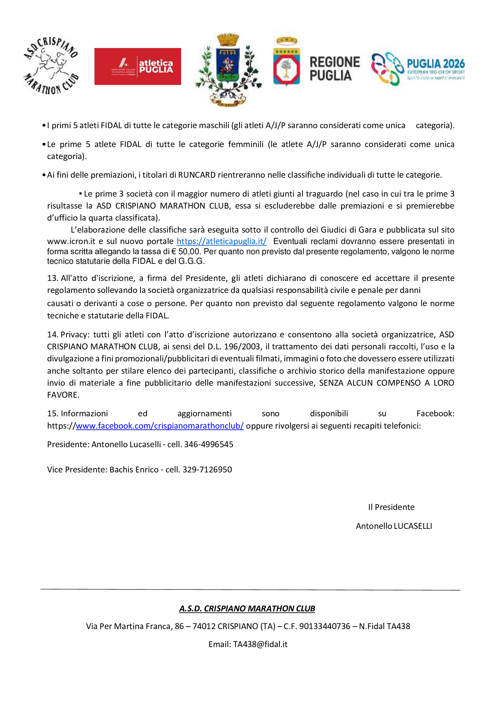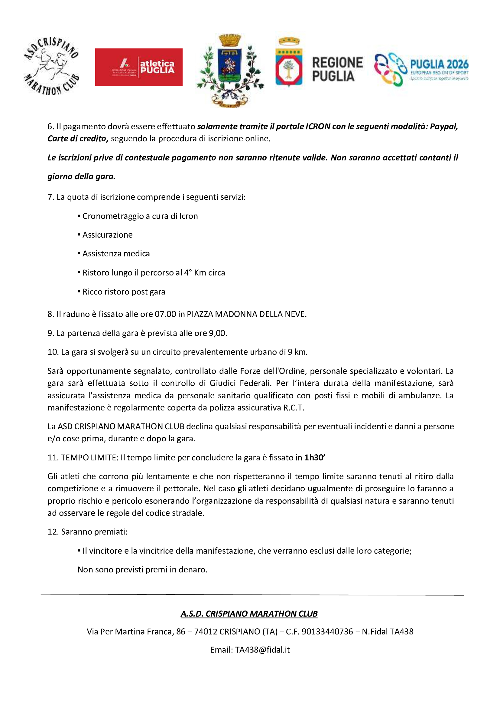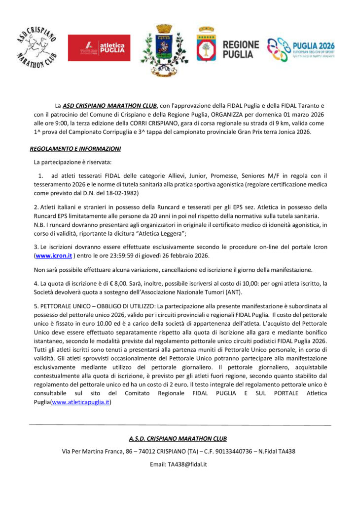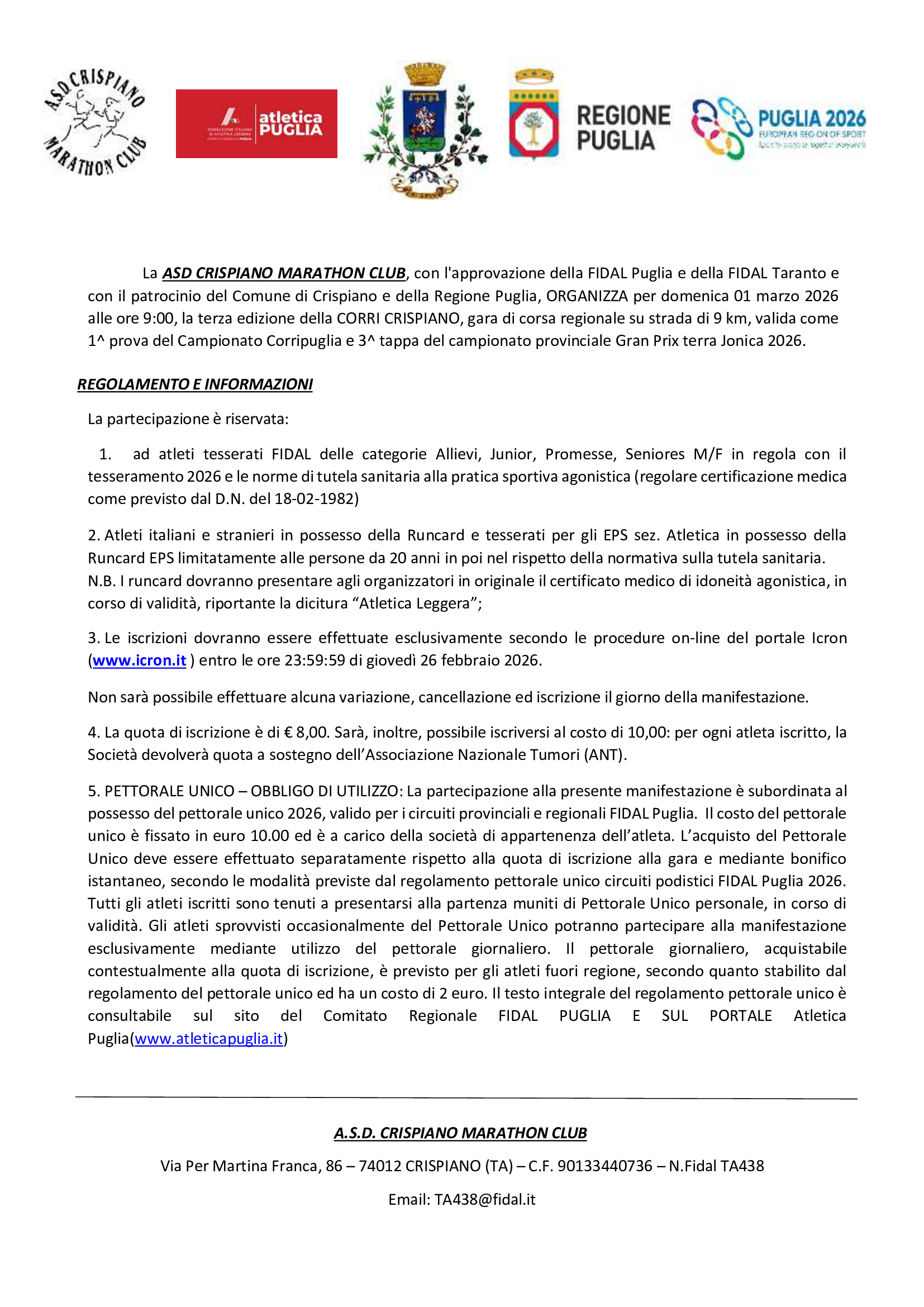 Corri Crispiano Data: 01/03/2026 Località: Crispiano (Ta) 🏆 📌 Luogo: Puglia / Taranto📏 Distanza (max): 9 km🔗 Sito: www.marathonclubcrispiano.it🔗 Sito: https://www.fidal.it/calendario/II%5E-CORRI-CRISPIANO/REG39714📧 Email: ta438@fidal.it📞 Telefono: 346.4996545 - 349.1419596 - 329.7126950Descrizione: Competitiva di Km 9. Volantino / Regolamento