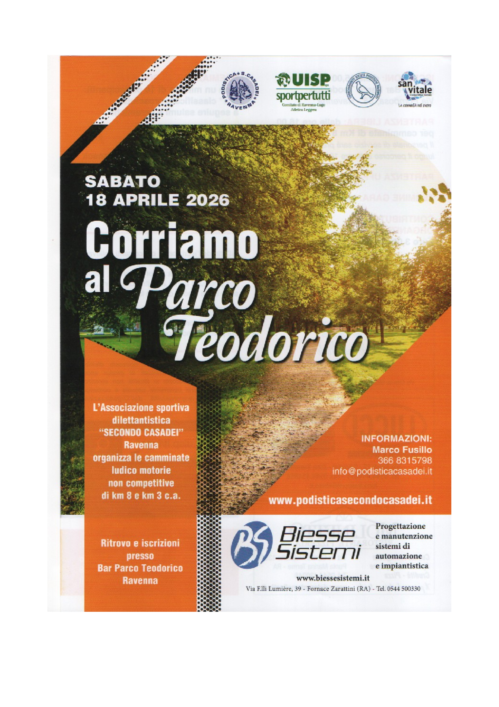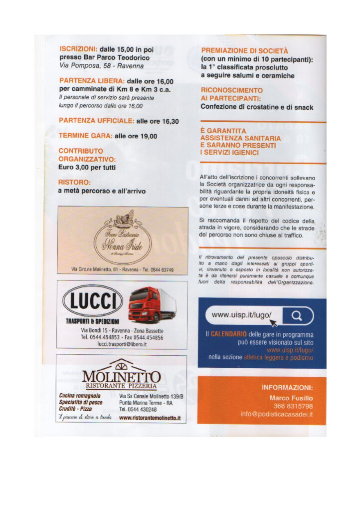 Corriamo al Parco Teodorico (8-3Km) Data: 18/04/2026 Località: Ravenna (Ra) 📌 Luogo: Emilia-Romagna / Ravenna⏰ Orario: dalle 16📏 Distanza (max): 8 km📍 Indirizzo: Ristoro Teodorico, 58, Via Pomposa, Teodorico, Ravenna, Emilia-Romagna, 48122, ItaliaDescrizione: Km 8 - Km 3 Volantino / Regolamento