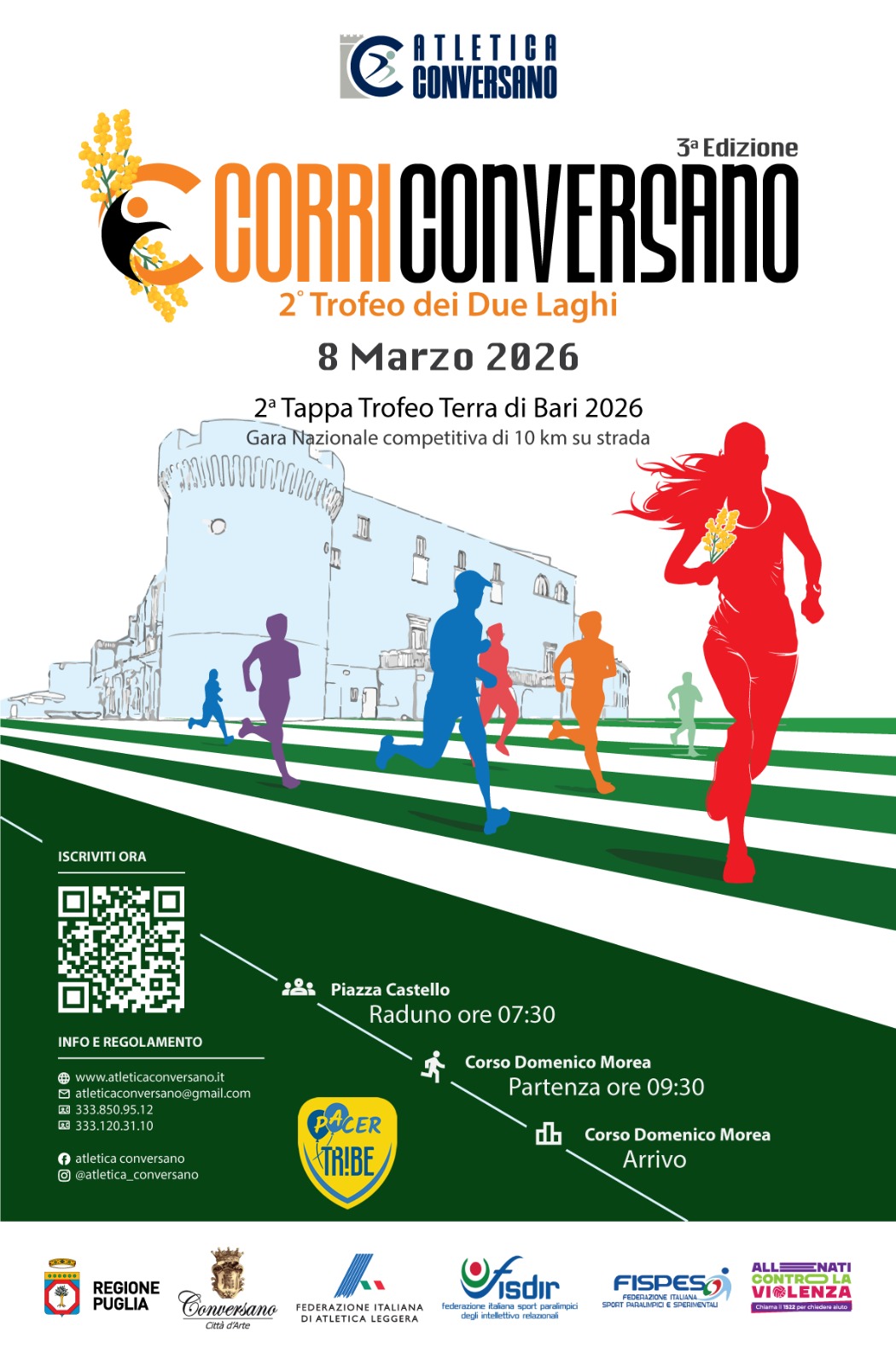 CorriConversano Data: 08/03/2026 Località: Conversano (Ba) 🏆 📌 Luogo: Puglia / Bari📏 Distanza (max): 10 km🔗 Sito: www.atleticaconversano.it📧 Email: atleticaconversano@gmail.com📞 Telefono: 333.1203110Descrizione: Competitiva e non di Km 10. Partenza ore 09:30 da Piazza Castello Volantino / Regolamento