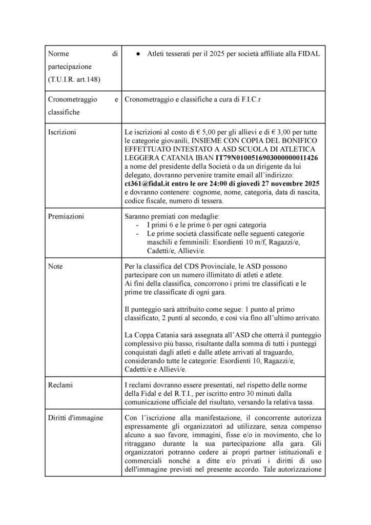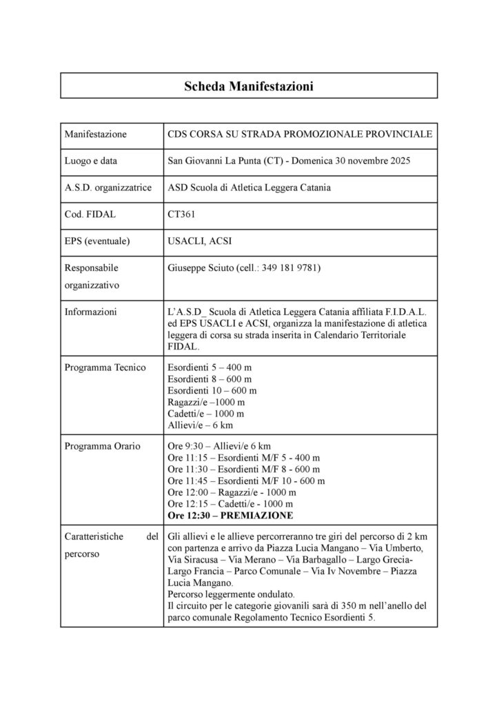 Corsa su strada promozionale Data: 30/11/2025 Località: San Giovanni la Punta (Ct) 🏆 📌 Luogo: Sicilia / Catania📏 Distanza (max): 6 kmDescrizione: Competitiva su varie distanze. Inizio gare ore 09:30 c/o Piazza Lucia Mangano Volantino / Regolamento