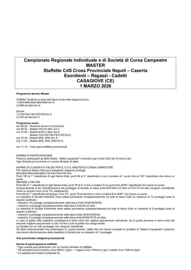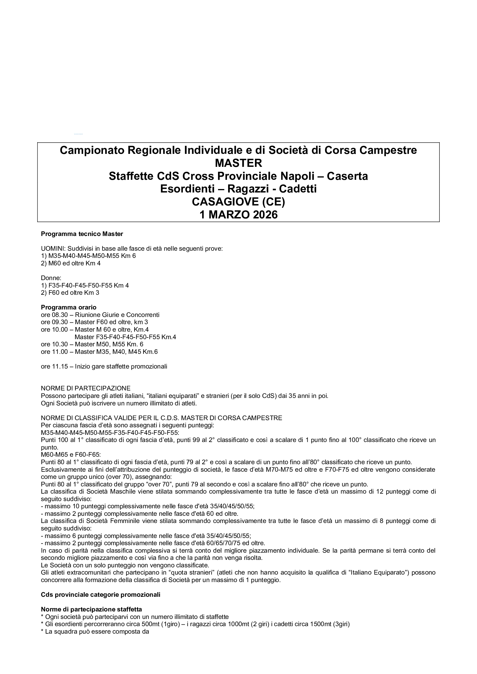 CRI e CDS Corsa Campestre Master Data: 01/03/2026 Località: Casagiove (Cs) 🏆 📌 Luogo: Campania / Caserta📍 Indirizzo: Casagiove, Caserta, Campania, ItaliaDescrizione: distanze diverse per categoria Volantino / Regolamento