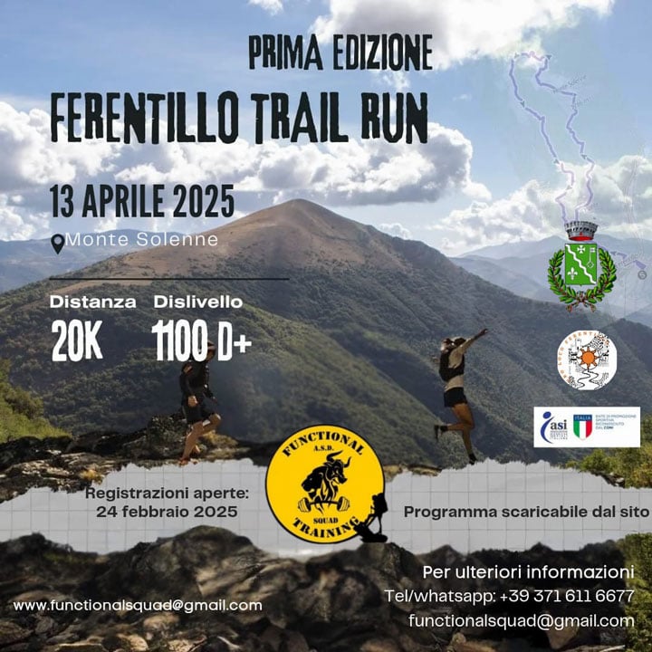 Ferentillo Trail Run Data: 13/04/2025 Località: Frosinone (FR) 🏆 🏅 Classifica: Clicca qui 📌 Luogo: Lazio / Frosinone⏰ Orario: 09:00📍 Indirizzo: ferentillo🔗 Sito: https://www.functionalsquad.it/📧 Email: info.functionalsquad@gmail.com📞 Telefono: 371 6116677 Volantino / Regolamento