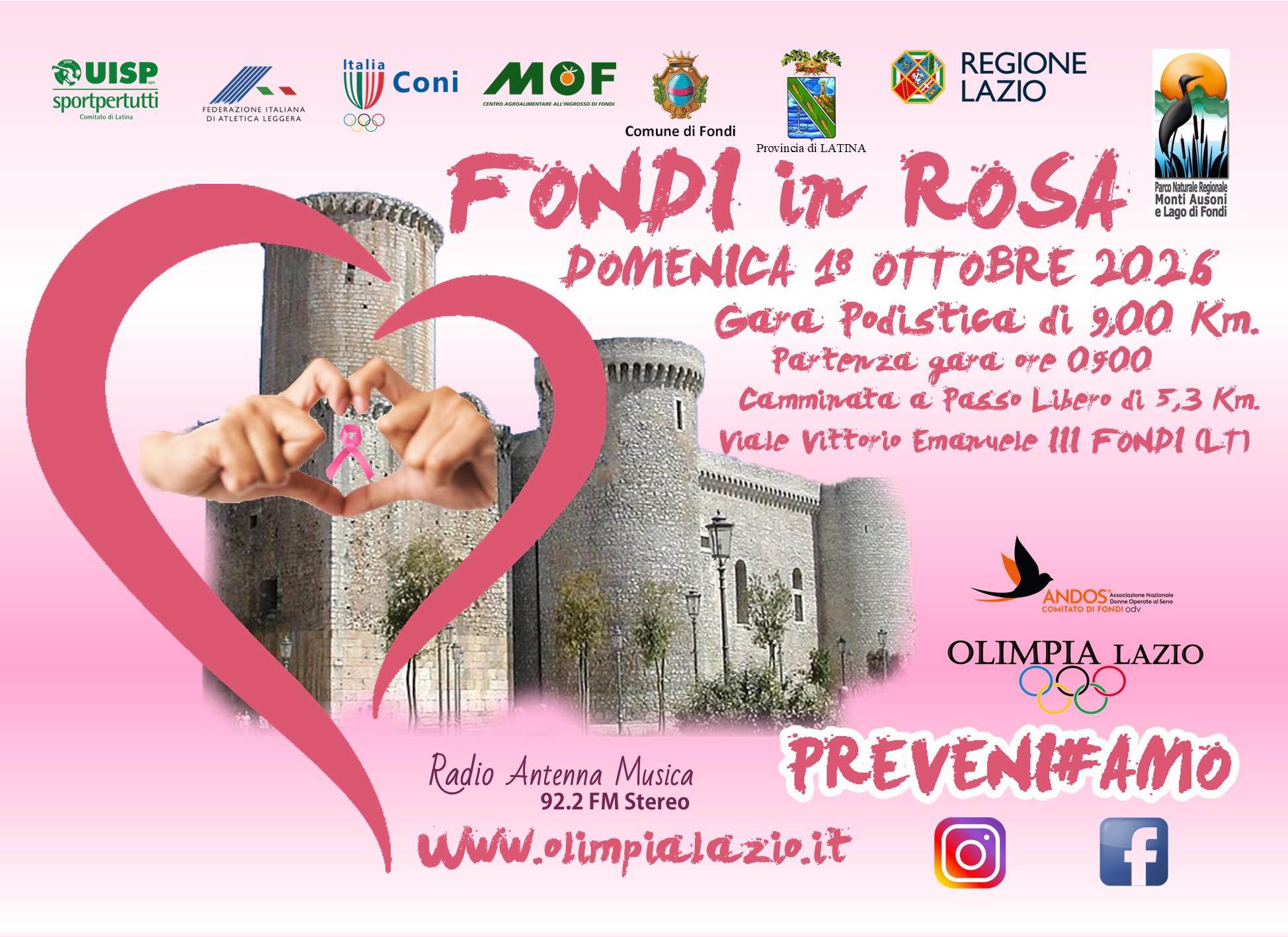Descrizione: gara in occasione dell'ottobre rosa dedicato alla lotta al tumore al seno. Pacco gara t-shirt tecnica con logo della manifestazione. parte delle quote di iscrizione devolute all'A.N.D.O.S. odv comitato di Fondi. Camminata a passo libero di 5,3 Km
