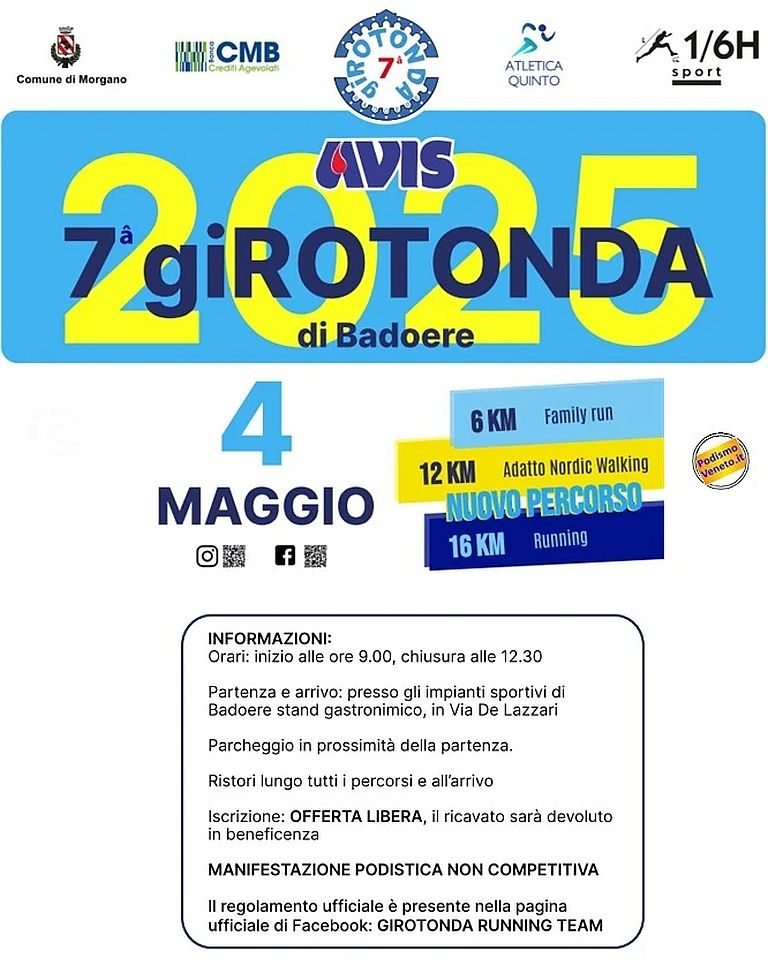 Descrizione: Non competitiva di Km 16 - 12 - 6. Partenza ore 09:00 c/o gli Impianti Sportivi di Badoere