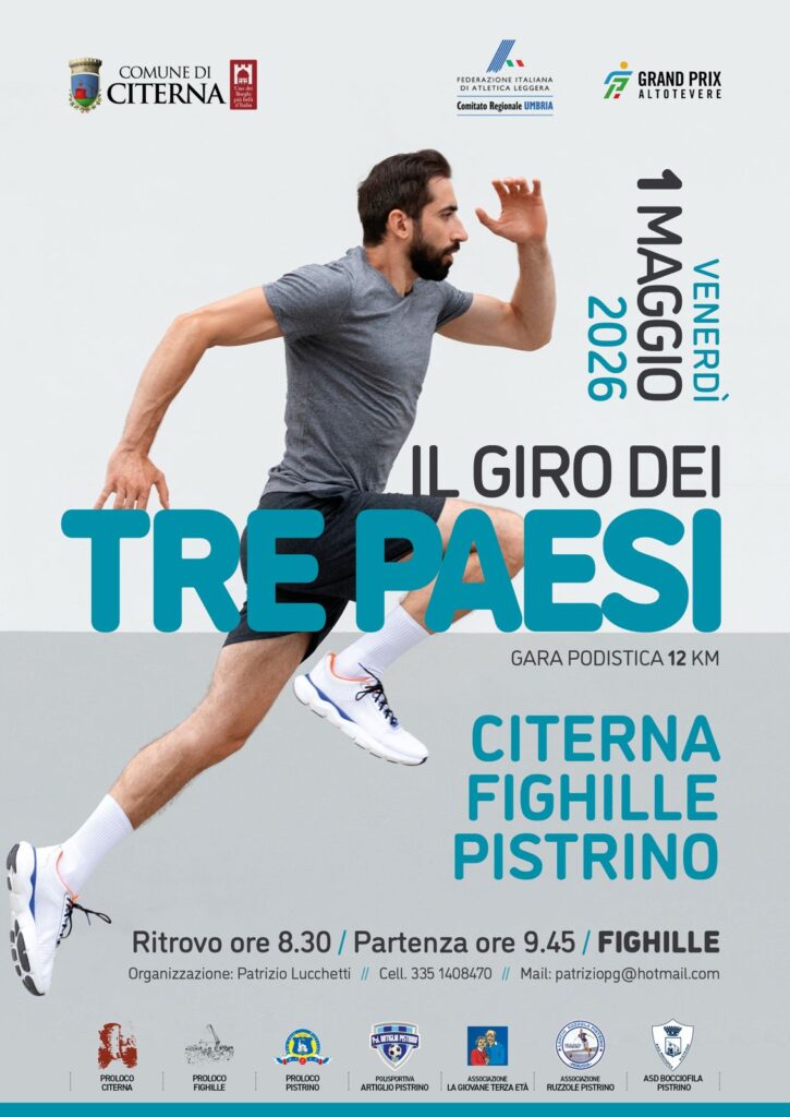Il Giro dei Tre Paesi Data: 01/05/2026 Località: Fighille - Citerna (Pg) 🏆 📌 Luogo: Umbria / Perugia📏 Distanza (max): 12 km📧 Email: patriziopg@hotmail.com📞 Telefono: 335.1408470Descrizione: Competitiva di Km 12. Partenza ore 09:45 dal Centro Sportivo Pampaloni, Fighille Volantino / Regolamento