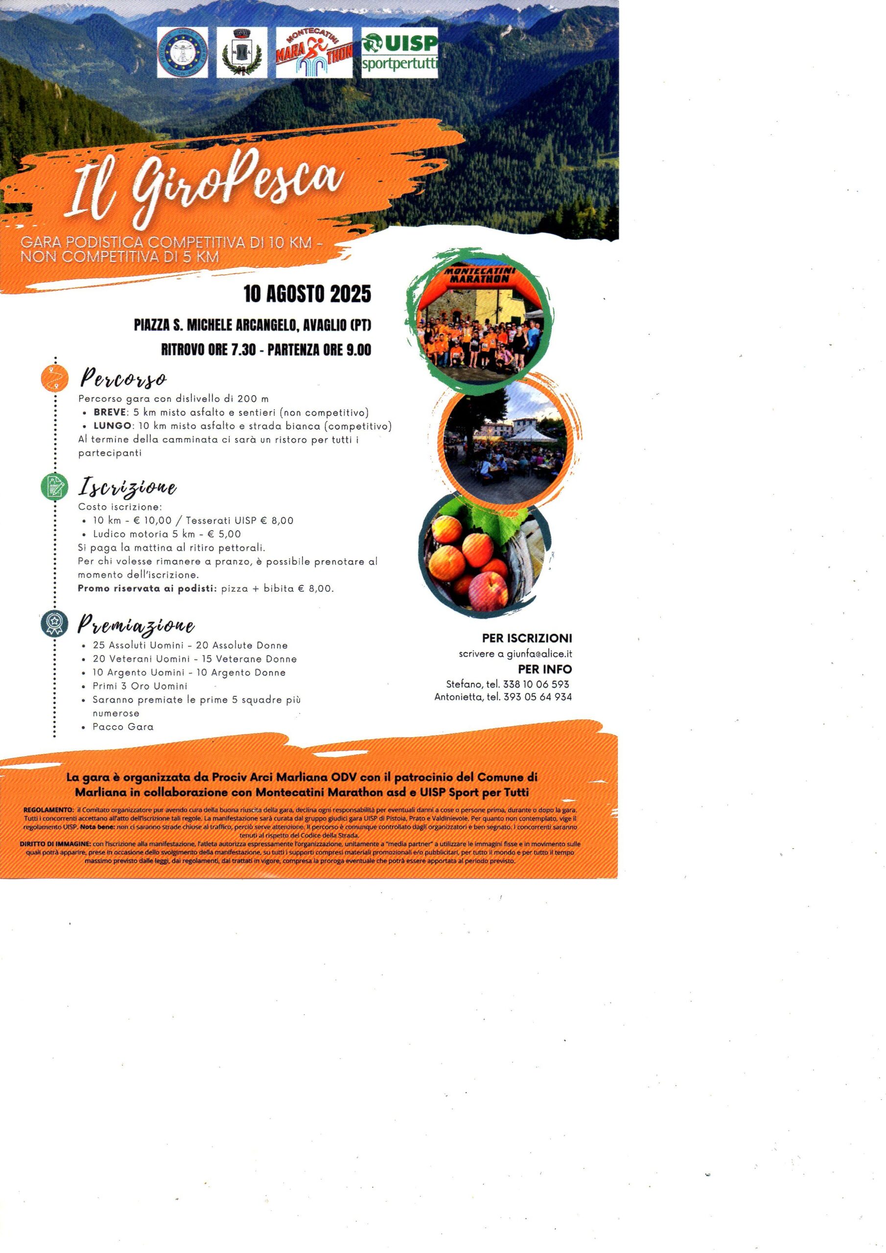Il GiroPesca Data: 10/08/2025 Località: Pistoia (PT) 🏆 🏅 Classifica: Clicca qui 📌 Luogo: Toscana / Pistoia⏰ Orario: 09:00📍 Indirizzo: AvaglioDescrizione: Km 10 competitivi Km 5 non competitivi Volantino / Regolamento