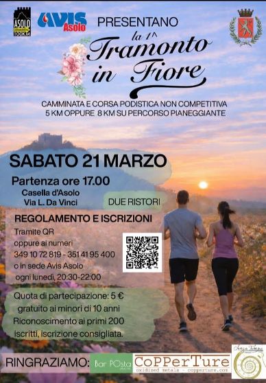 La 1° Tramonto in Fiore (8-5Km) Data: 21/03/2026 Località: Asolo (Tv) 📌 Luogo: Veneto / Treviso⏰ Orario: 17,00📏 Distanza (max): 8 km📍 Indirizzo: Casella d'Asolo, Asolo, Fonte, Treviso, Veneto, 31011, ItaliaDescrizione: Km 8 - Km 5 Volantino / Regolamento