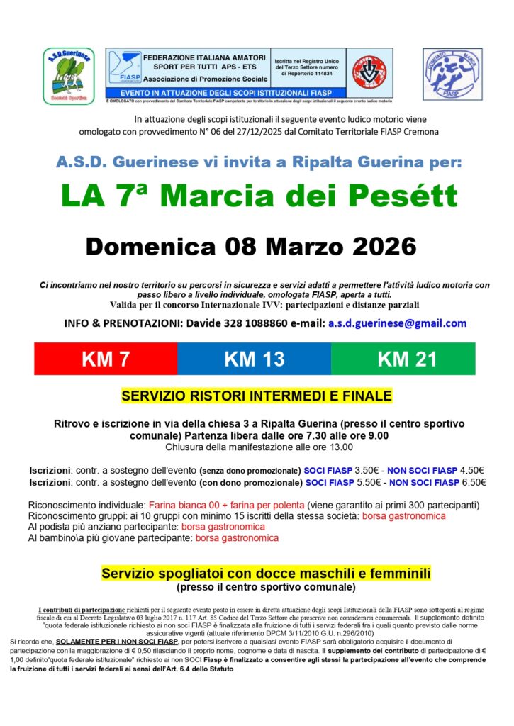 La 7° Gara dei Pesétt Data: 08/03/2026 Località: Ripalta Guerina (Cr) 📌 Luogo: Lombardia / Cremona⏰ Orario: 7,30 - 9,00📏 Distanza (max): 21 km📍 Indirizzo: Centro Sportivo via della Chiesa 3 Ripalta Guerina CremonaDescrizione: Km 7 - Km 13 - Km 21 Volantino / Regolamento