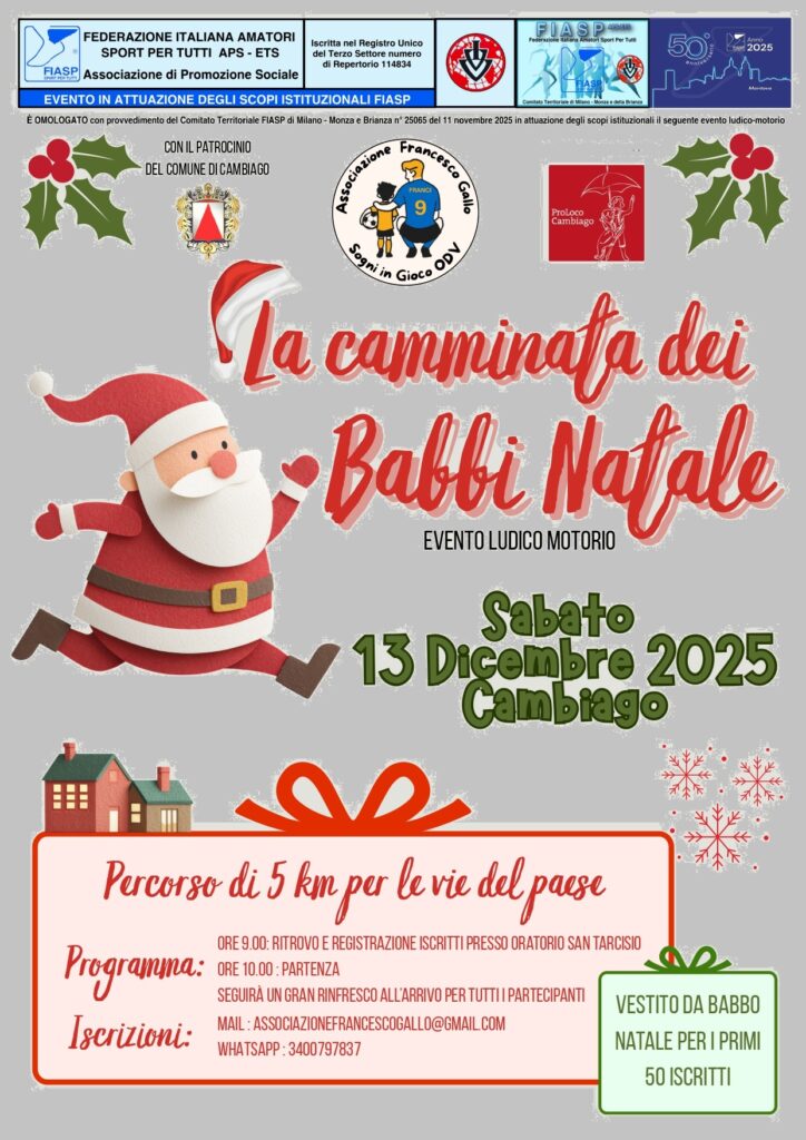 La camminata dei Babbi Natale Data: 13/12/2025 Località: Cambiago (Mi) 📌 Luogo: Lombardia / Milano⏰ Orario: 10:00📏 Distanza (max): 5 km📧 Email: associazionefrancescogallo@gmail.com📞 Telefono: 340.0797837Descrizione: Ludico motoria di Km 5. Partenza ore 10:00 dall'Oratorio San Tarcisio, via Vittorio Veneto 2 Volantino / Regolamento