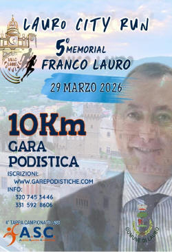 Lauro City Run Data: 29/03/2026 Località: Lauro (Av) 🏆 📌 Luogo: Campania / Avellino📏 Distanza (max): 10 km📞 Telefono: 389.8785375 - 392.0712034 - 320.7453446Descrizione: Competitiva di Km 10. Partenza ore 08:45 c/o Arco di Fellino Volantino / Regolamento