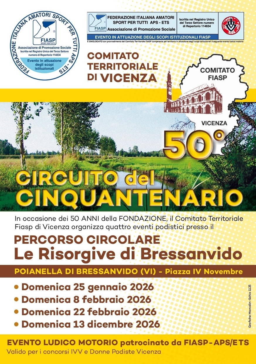 Le Risorgive di Bressanvido Data: 13/12/2026 Località: Poianella - Bressanvido (Vi) 📌 Luogo: Veneto / Vicenza📏 Distanza (max): 0 kmDescrizione: Ludico motoria su percorso circolare. Partenza c/o Piazza IV Novembre Volantino / Regolamento