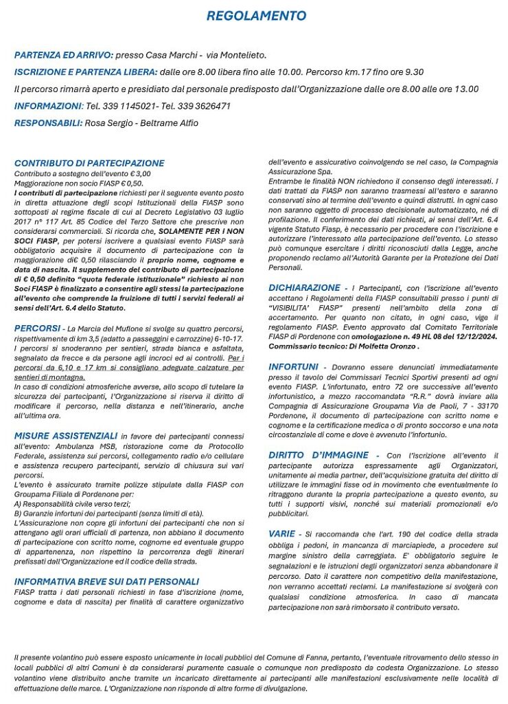 Descrizione: Ludico motoria di km 17 (D+650m), Km 10 (D+390m), Km 6 (D+180m) e Km 3,5 (D+95m). Partenza ore 08:00/10:00 c/o il parcheggio di via Montelieto 29