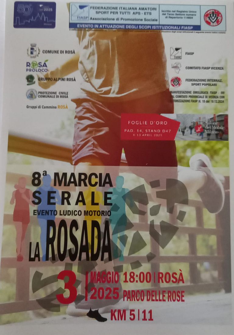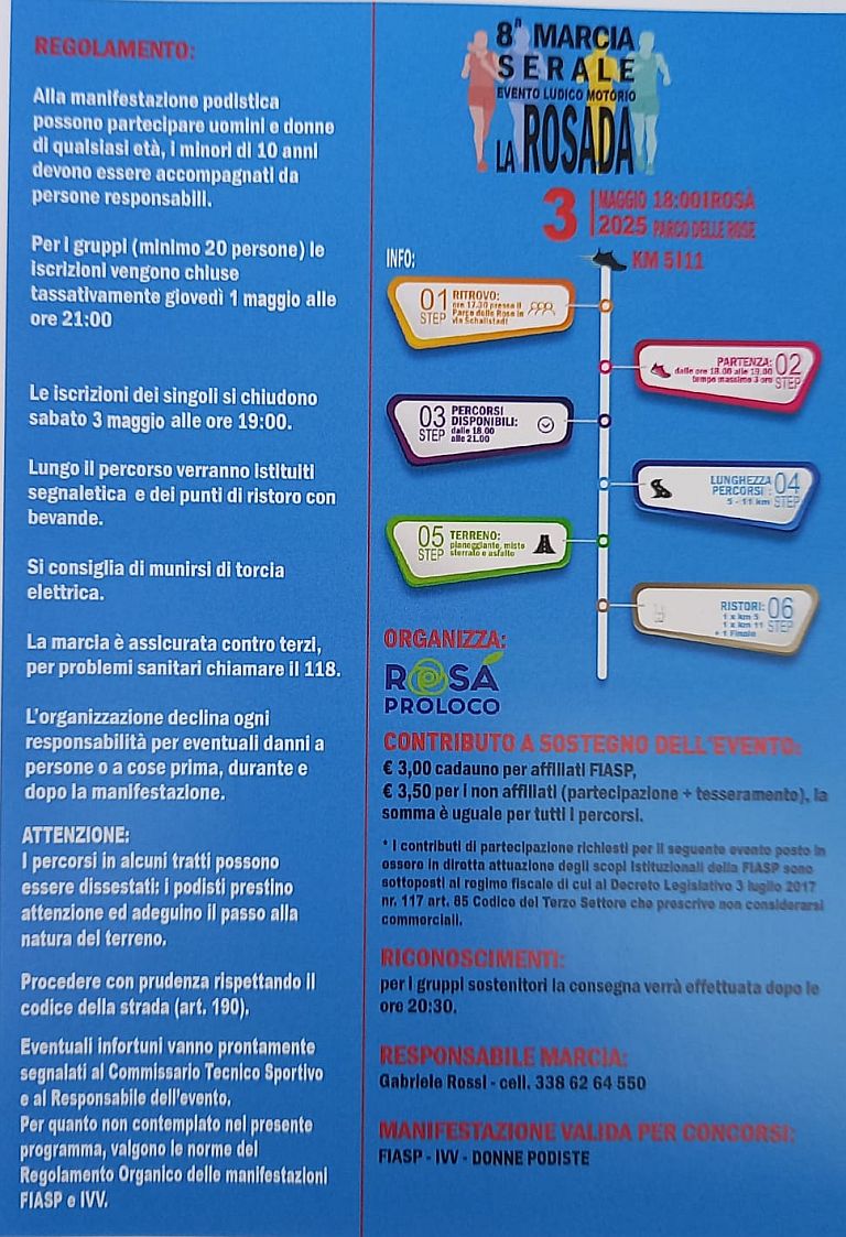 Marcia La Rosada Data: 02/05/2026 Località: Rosà (Vi) 📌 Luogo: Veneto / Vicenza📏 Distanza (max): 11 km📧 Email: lelerossi56@gmail.com📞 Telefono: 338.6264550Descrizione: Ludico motoria di Km 11 e Km 5. Partenza ore 18:00/19:00 c/o Parco delle Rose, Via Schallstadt Volantino / Regolamento